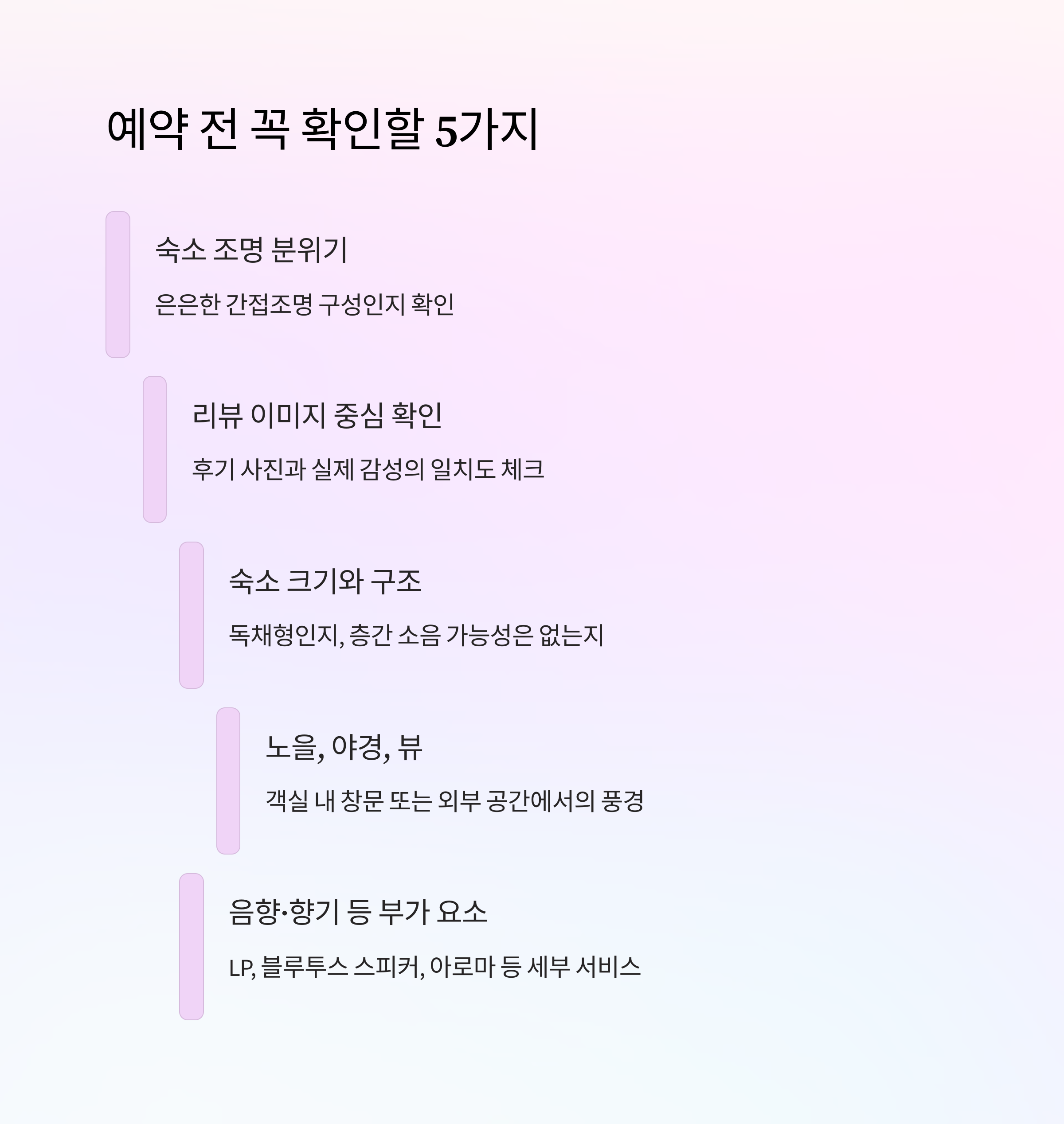 - 숙소 조명 분위기: 밝기보단 은은한 간접조명 구성인지 확인