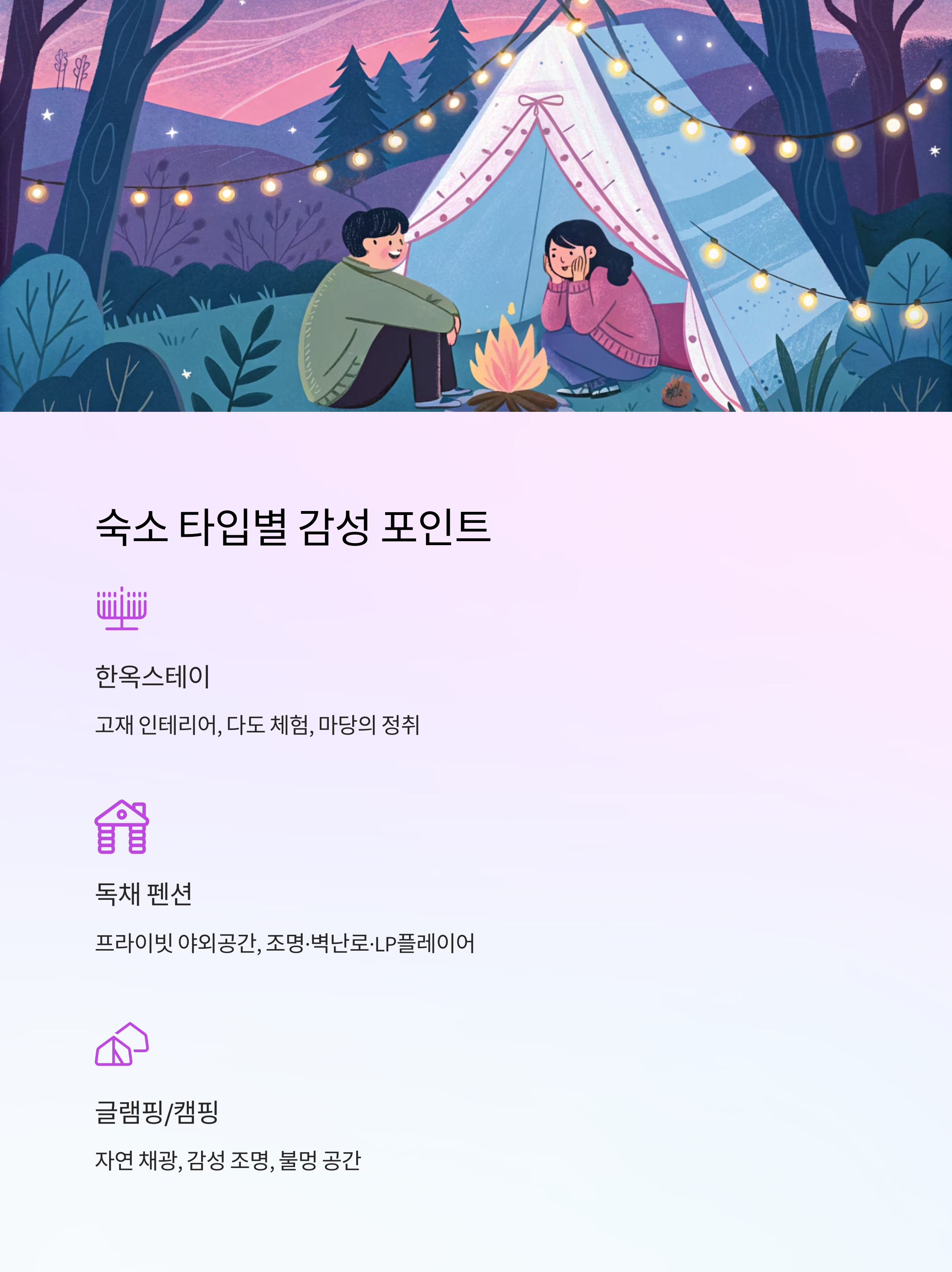 | 자연 속 힐링 | "숲속 감성 숙소", "바다 감성 한옥스테이" |
