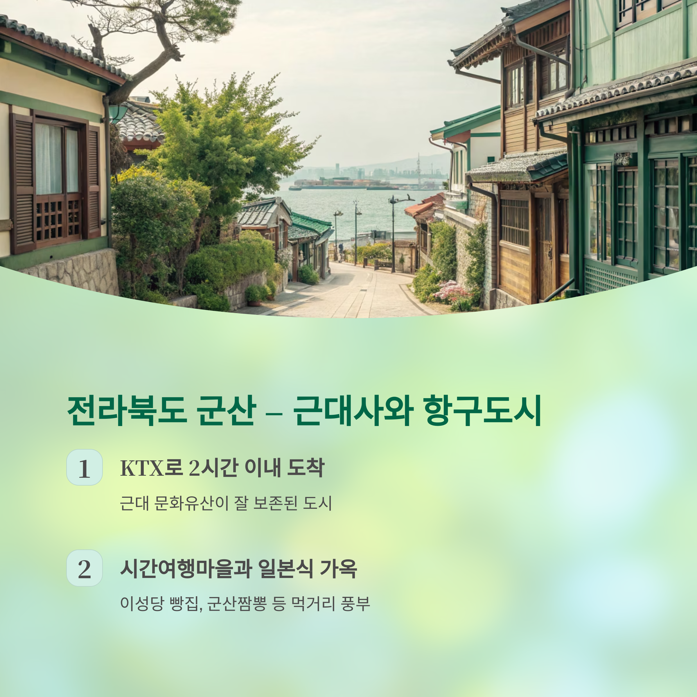| 군산 | 근대문화, 항구도시 | 약 2시간 | KTX/고속버스 |