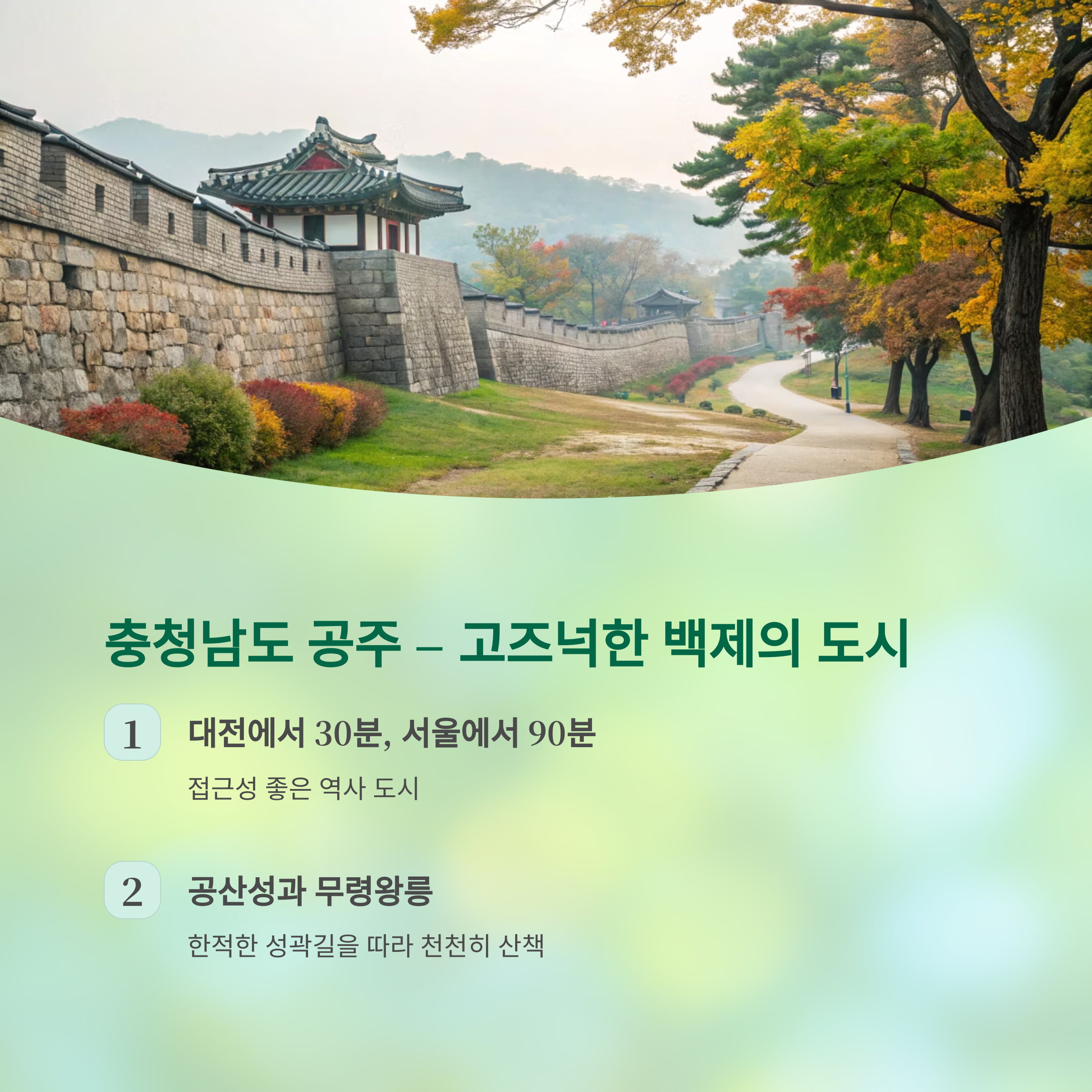 | 공주 | 역사 유적, 시장 투어 | 약 1시간 30분 | 고속버스 |