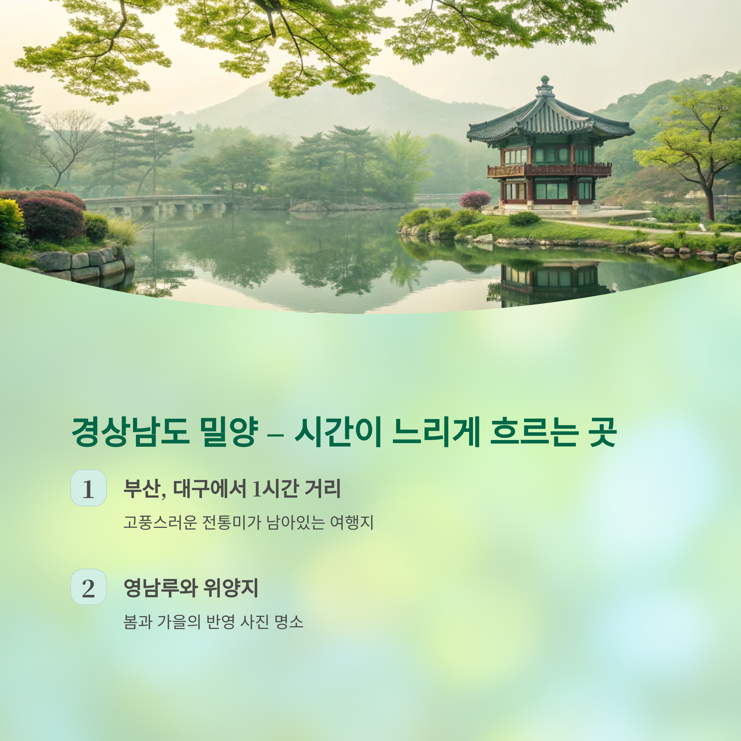 | 밀양 | 전통건축, 강변 경관 | 약 1시간 | 기차/자가용 |