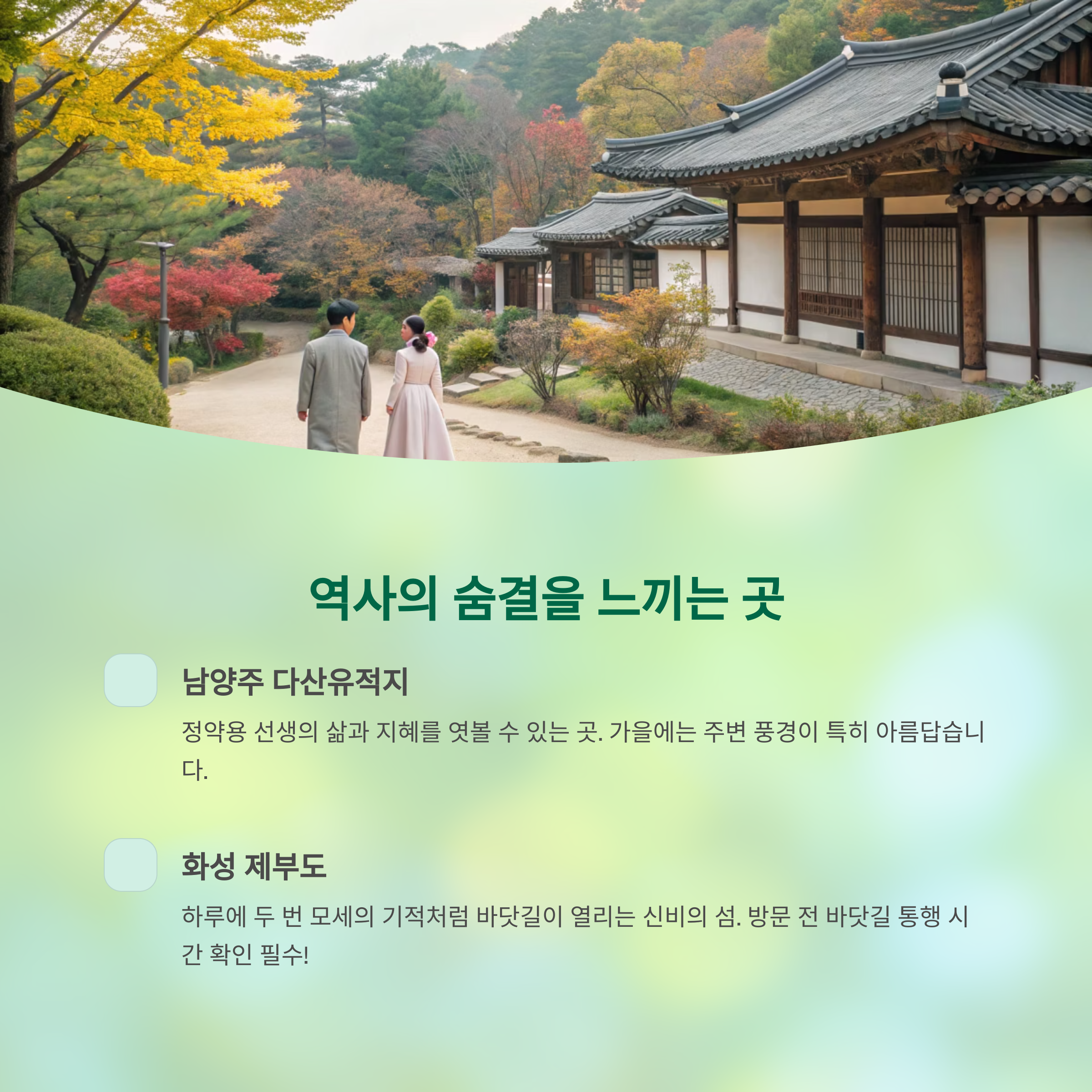 경기도에는 고즈넉한 풍경과 함께 우리 역사의 흔적을 느낄 수 있는 장소들도 많아요. 복잡한 도심을 벗어나 시간 여행을 떠나보는 건 어떠세요?