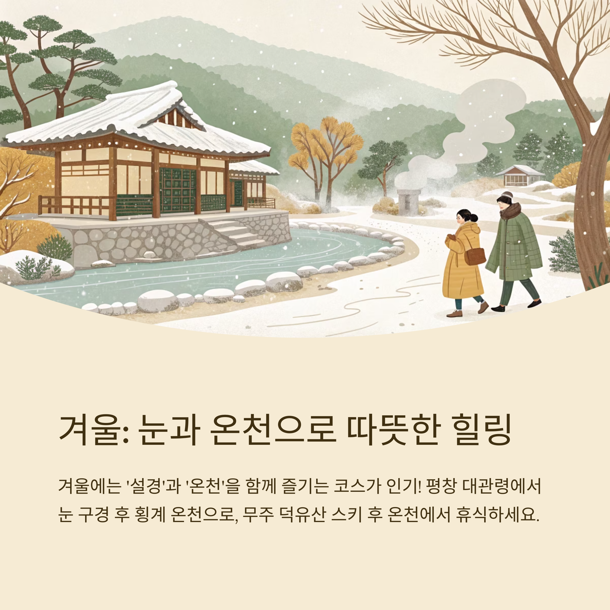 겨울에는 ‘따뜻함’과 ‘설경’을 동시에 누릴 수 있는 코스를 구성하는 것이 핵심입니다.