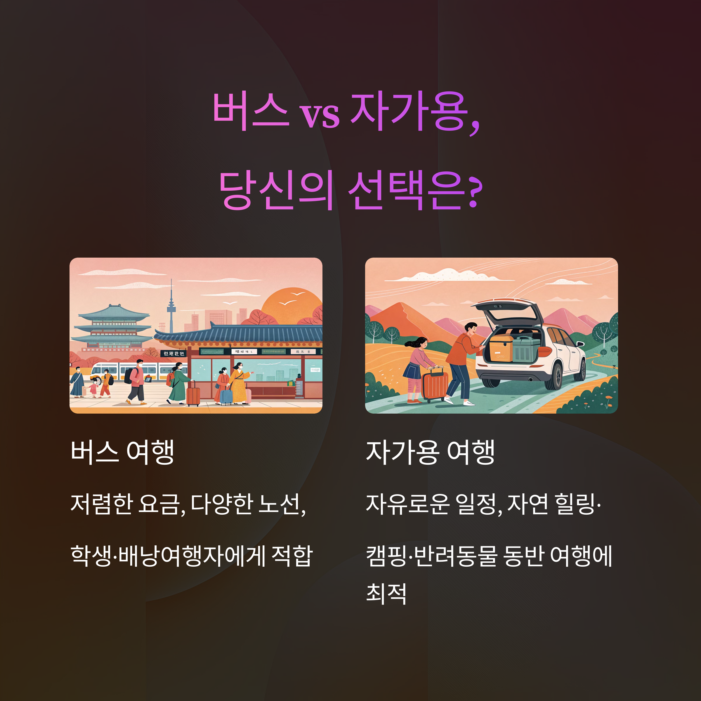 | 고속버스 | 대전, 춘천, 청주 | 알뜰 실속형 | 학생·가성비 여행자 |