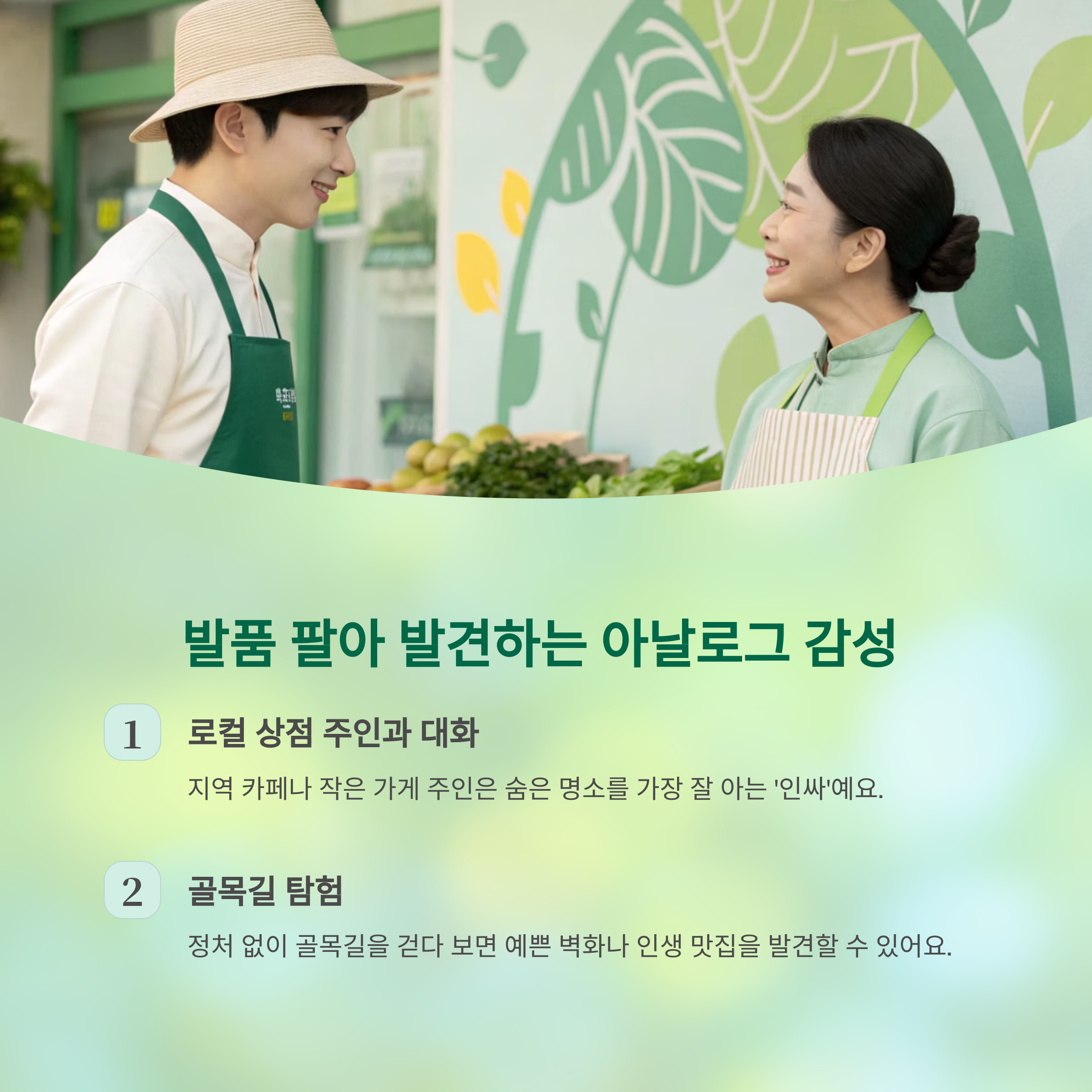 지역의 작은 카페, 식당, 기념품 가게 등 로컬 상점의 주인장들은 그 지역의 진짜 '인싸'들이에요. 그분들만큼 숨은 명소를 잘 아는 사람들은 없죠! 친근하게 말을 걸고, 조용하고 예쁜 곳을 추천해달라고 부탁해보세요. 저도 강릉의 한 작은 책방 주인장님 덕분에 숨겨진 해변 카페를 알게 되어 너무 좋았답니다.