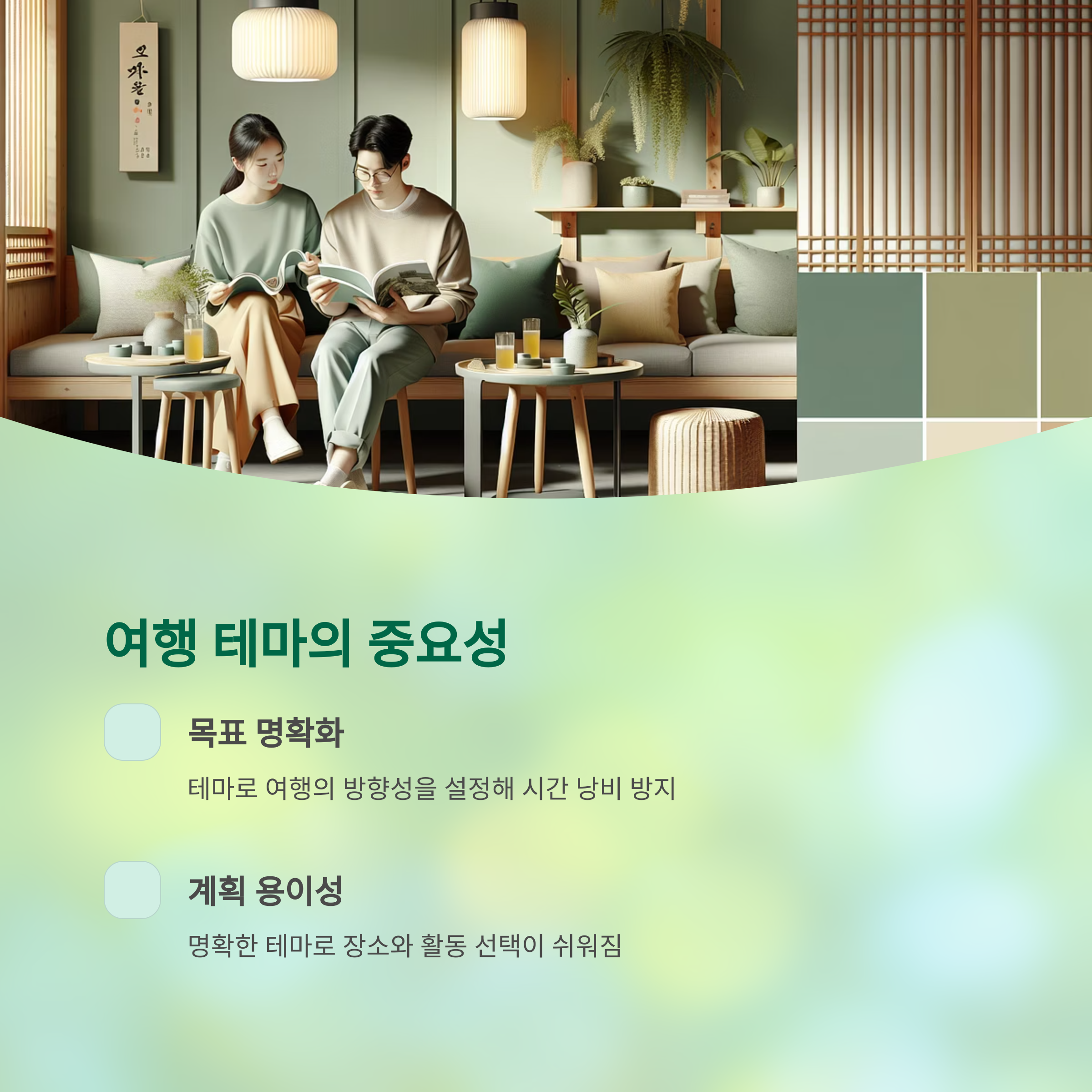 - 여행 테마의 중요성: 막연한 여행보다는 명확한 테마를 설정하여 여행의 목적을 분명히 하고, 효율적인 계획을 세울 수 있습니다.