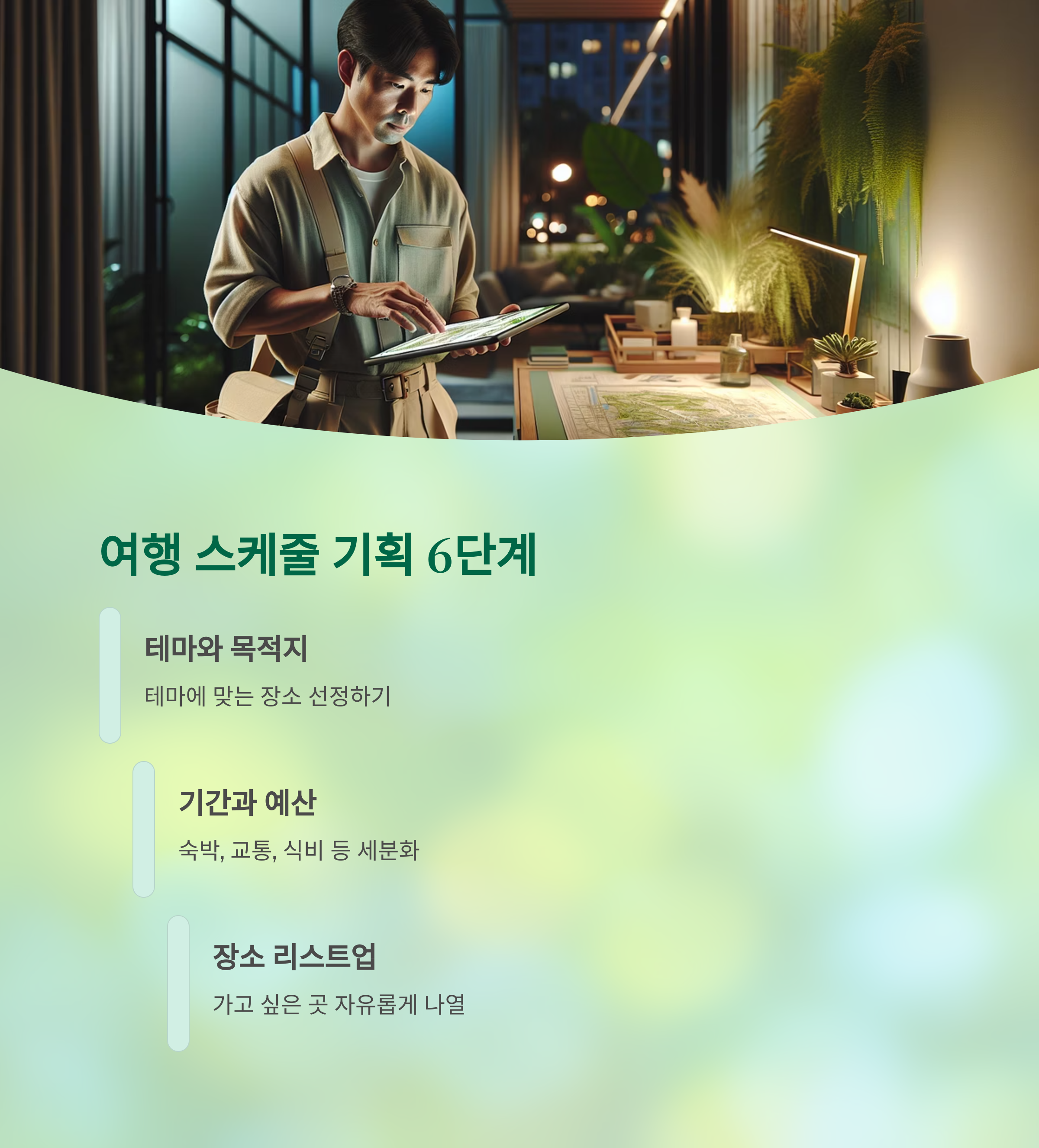 - 스케줄 기획 6단계: 테마 설정부터 예비 시간 확보까지, 체계적인 6단계 기획 방식을 통해 유연하고 만족도 높은 여행을 만들 수 있습니다.