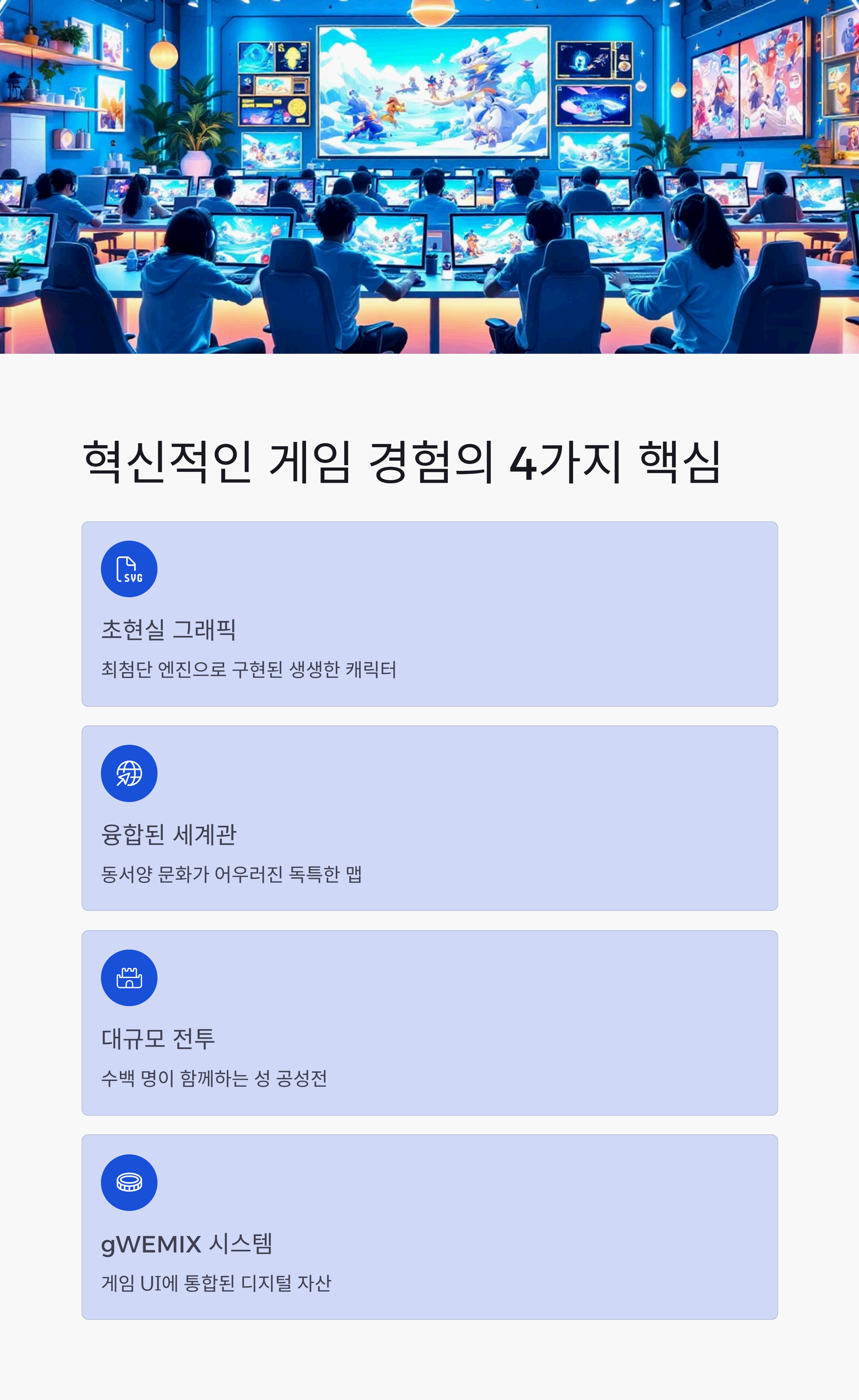 | 경제 시스템 | gWEMIX 기반의 P&E(Play and Earn) 모델 | 게임 플레이를 통한 실질적 가치 창출 |