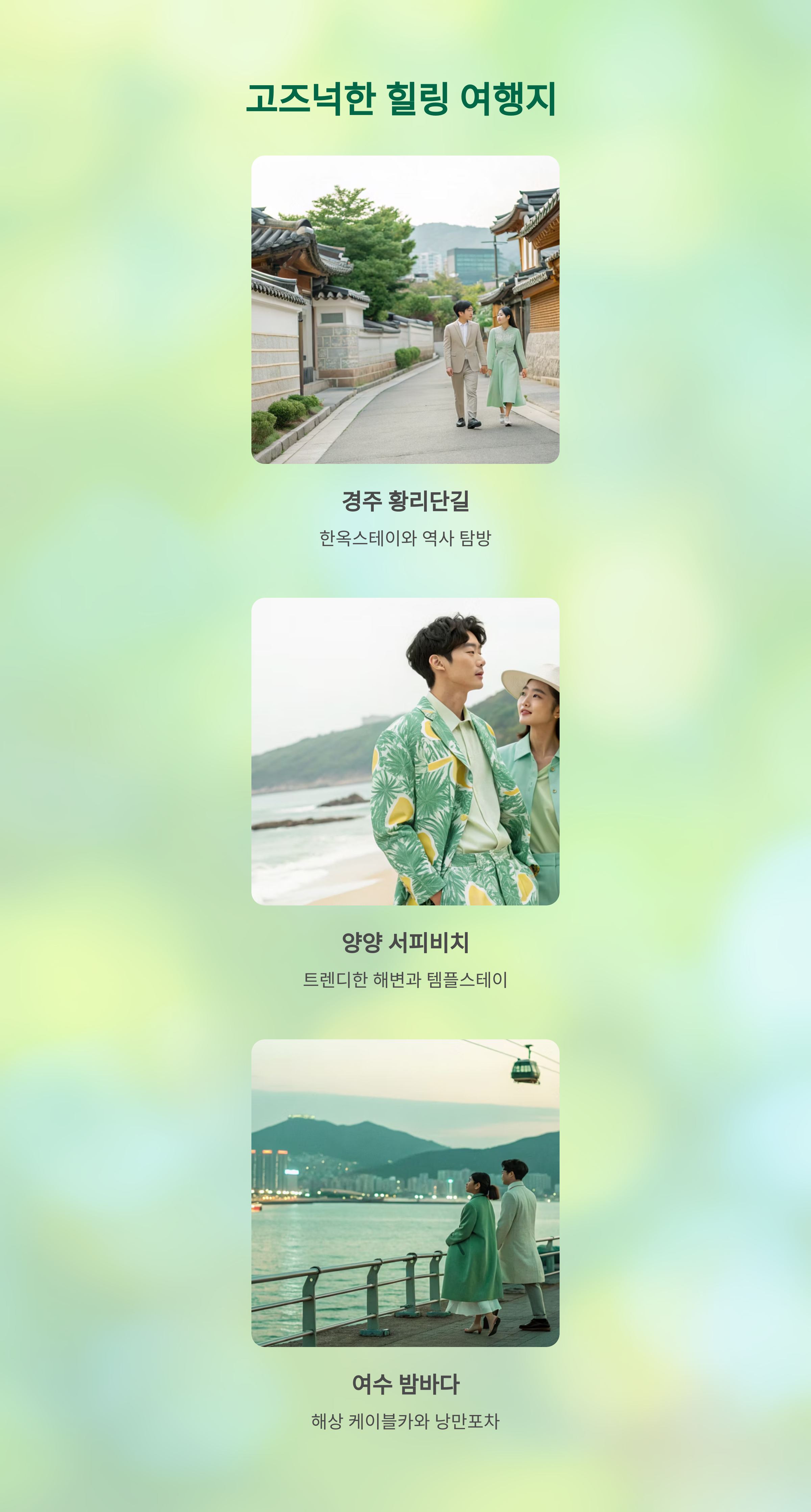 - 강원도 양양 서피비치 & 템플스테이: 트렌디한 서피비치에서 잠시 젊음의 에너지를 느끼고, 근처 사찰에서 템플스테이를 하며 고요한 휴식을 취해보세요. 상반된 매력의 조합이 의외로 잘 어울린답니다.