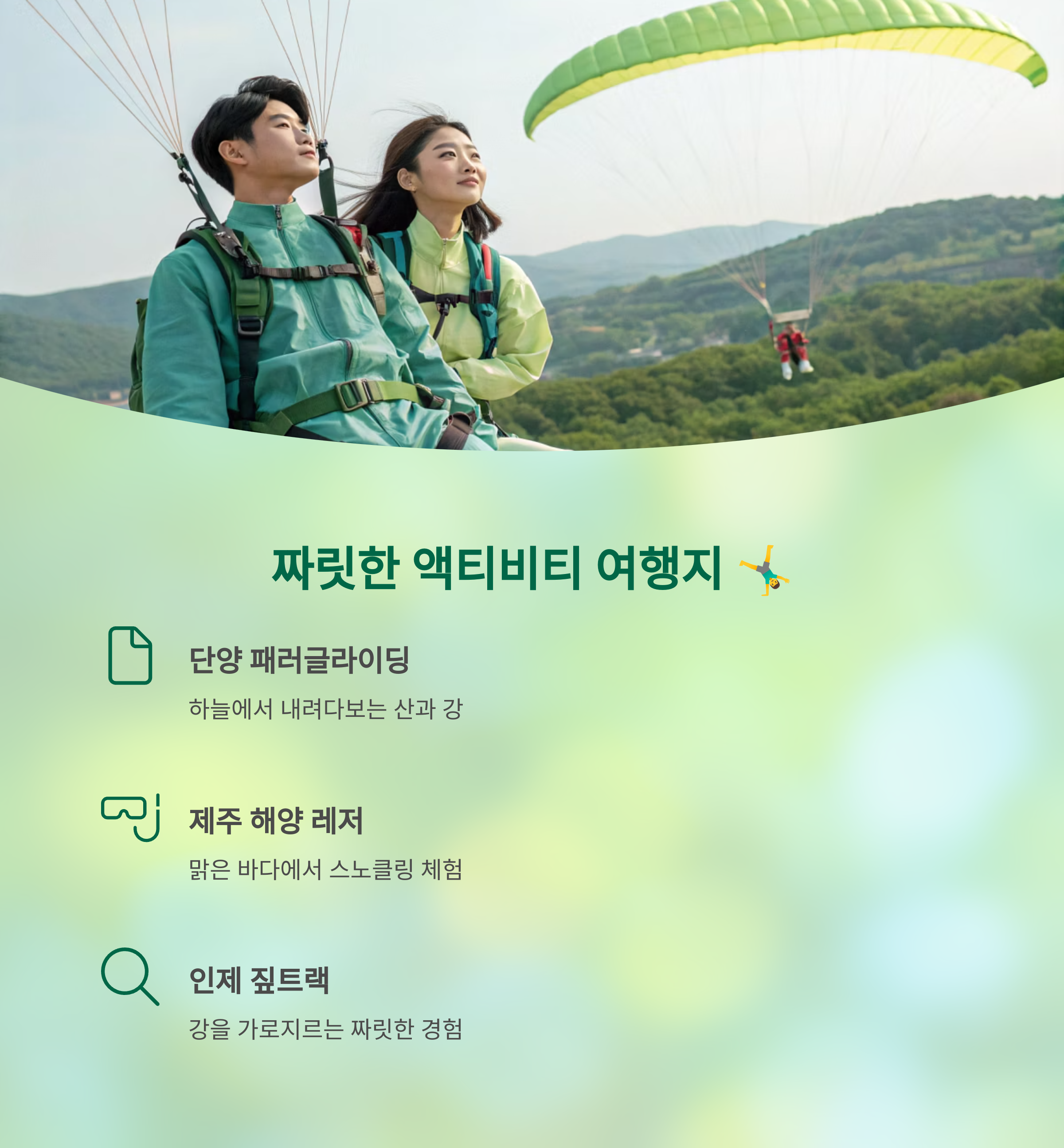 - 충청북도 단양 패러글라이딩: 단양의 아름다운 산과 강을 하늘에서 내려다보는 짜릿한 경험! 전문가와 함께하는 탠덤 비행이라 안전하고, 둘이 함께 하늘을 나는 기분은 정말 잊을 수 없을 거예요.