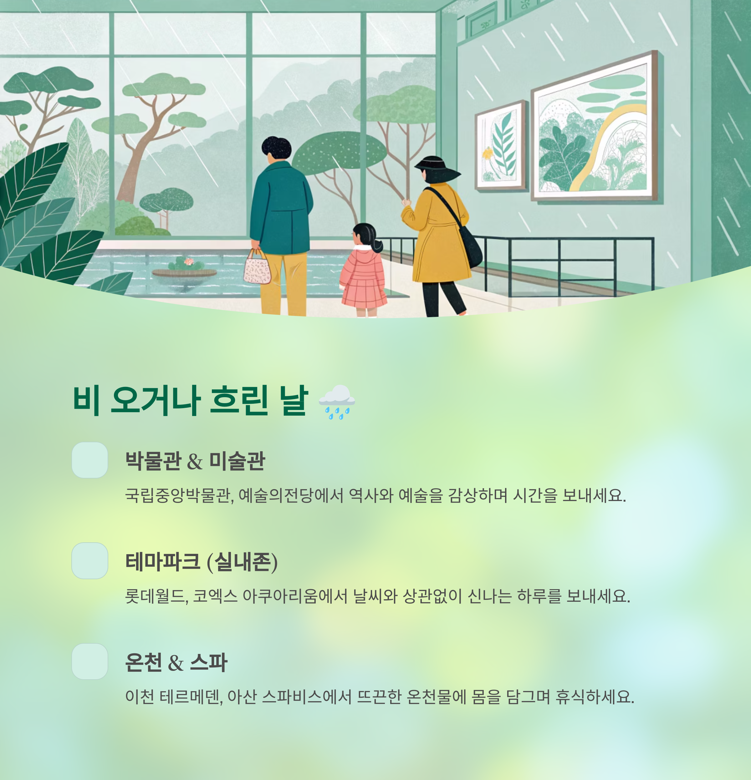 - 비 오거나 흐린 날씨: 박물관, 미술관, 실내 테마파크, 전통 시장, 식물원 등 실내 활동으로 안전하고 편안하게 즐기세요.