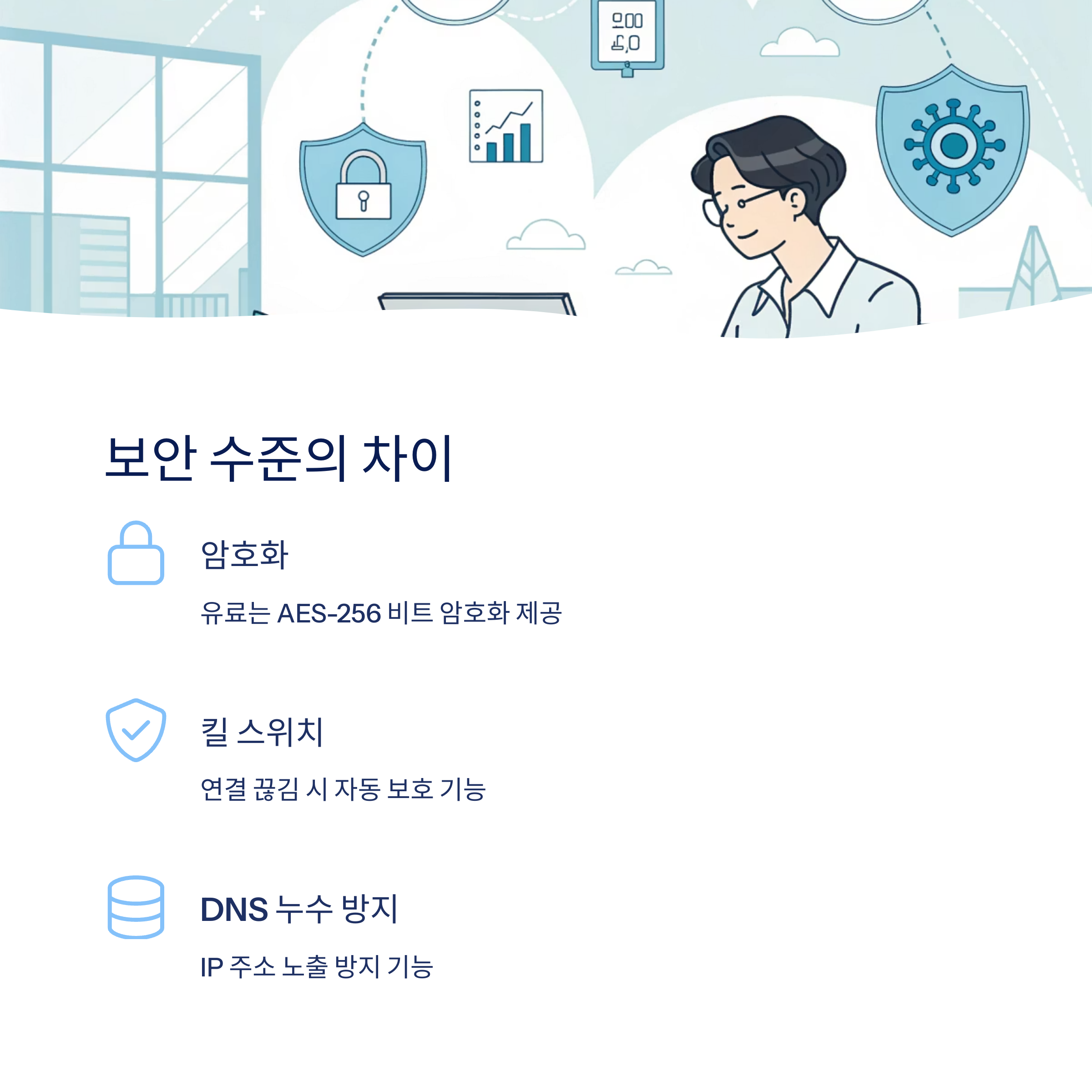 그에 반해 유료 VPN은 AES-256 비트 암호화, 킬 스위치,
