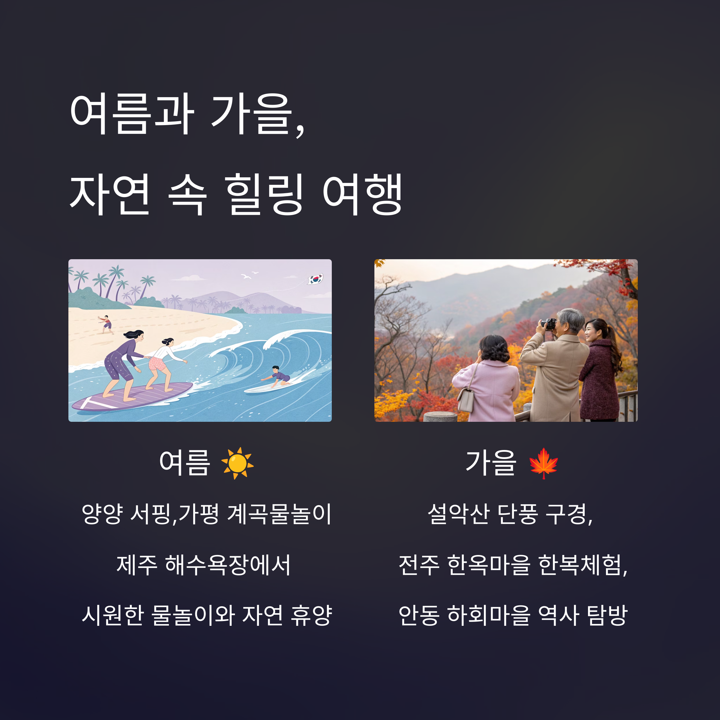 - 여름 여행: 시원한 물놀이와 레저 활동을 즐길 수 있는 양양, 가평, 제주의 해변과 계곡이 최고예요.