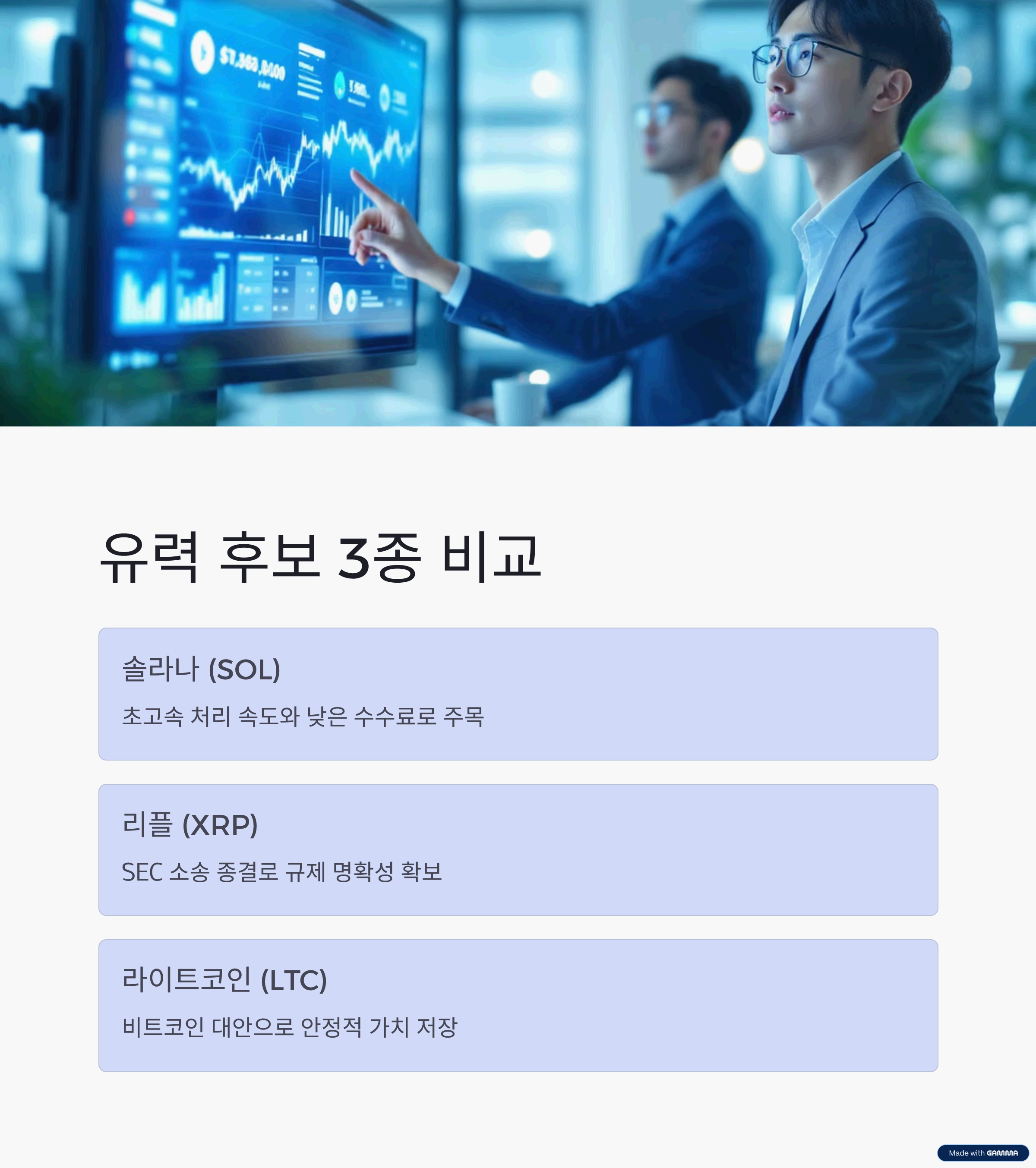 이더리움 다음 타자는 누구일까요? 비트코인, 이더리움 현물 ETF 승인 이후 암호화폐 시장의 관심은 온통 '다음 알트코인 ETF'에 쏠려 있습니다. 이 글에서는 가장 유력한 후보로 꼽히는 솔라나, XRP, 라이트코인의 가능성을 심층 분석하고, 현명한 투자 전략까지 명쾌하게 정리해 드립니다.