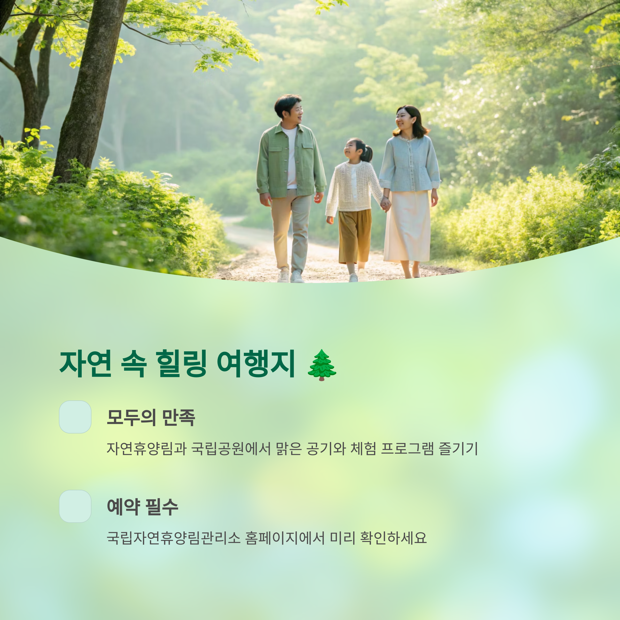 자연휴양림은 예약이 필수인 경우가 많으니, 방문 전에 반드시 국립자연휴양림관리소 홈페이지에서 예약 현황을 확인하세요!