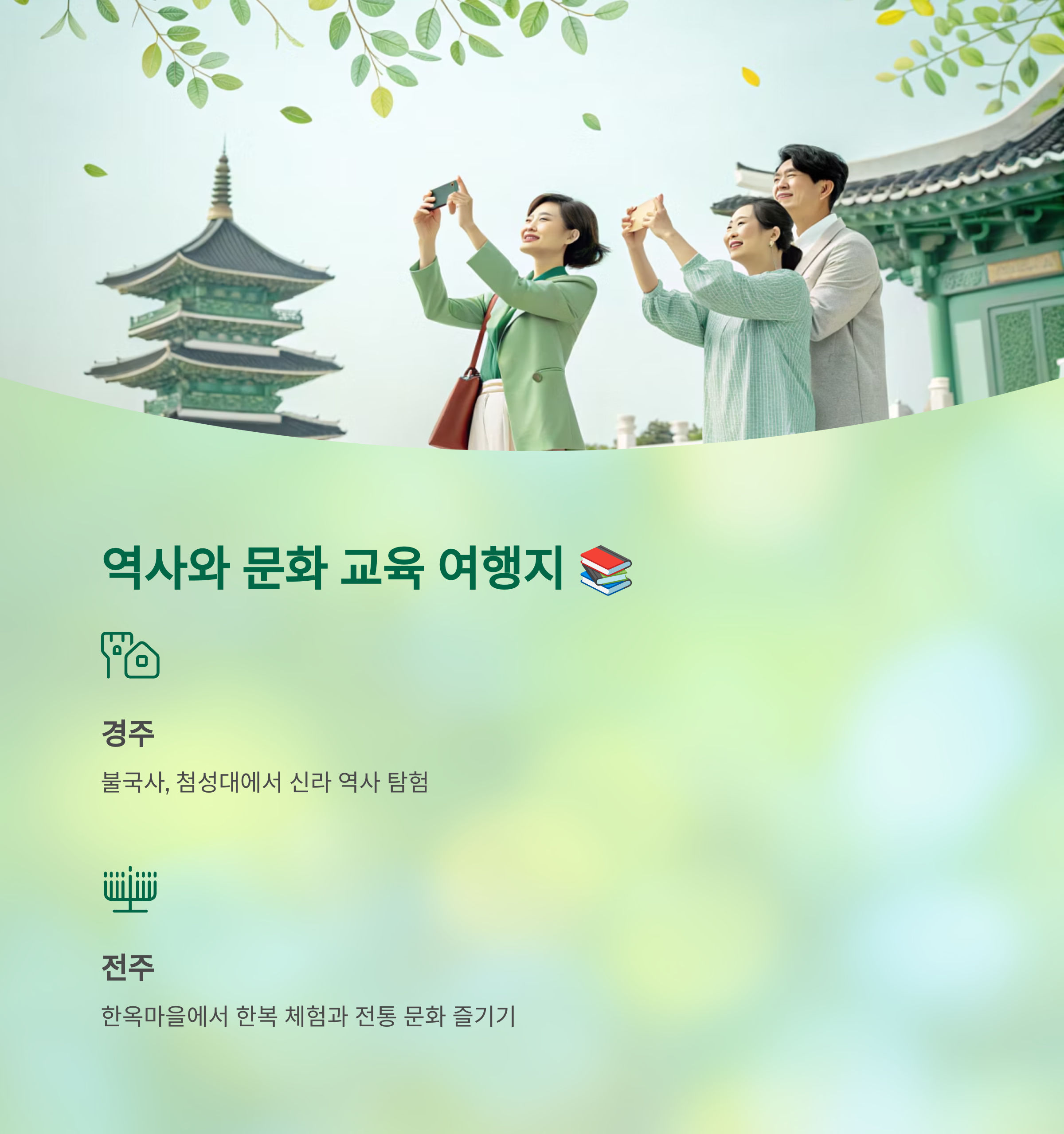 | 경주 | 불국사, 석굴암, 첨성대, 동궁과 월지 | 신라 유적지 밀집, 역사 교육의 장 | 넓은 유적지에서 뛰어놀기 좋음, 문화 해설 프로그램 |