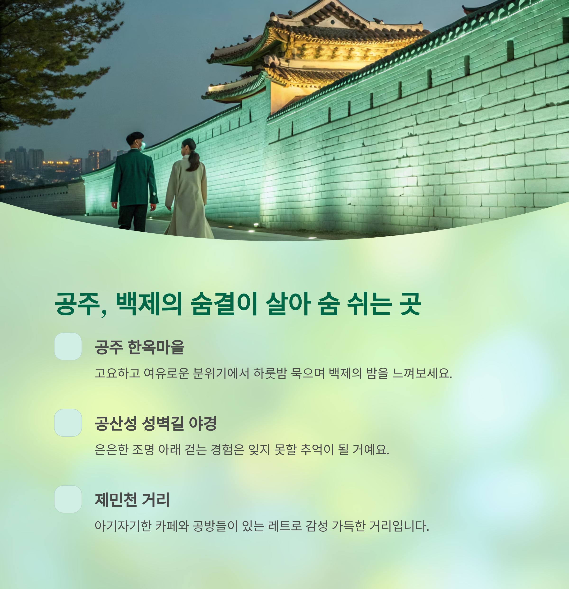 - 공주: 한옥마을, 공산성 야경, 제민천에서 백제의 역사와 레트로 감성을 느껴보세요.