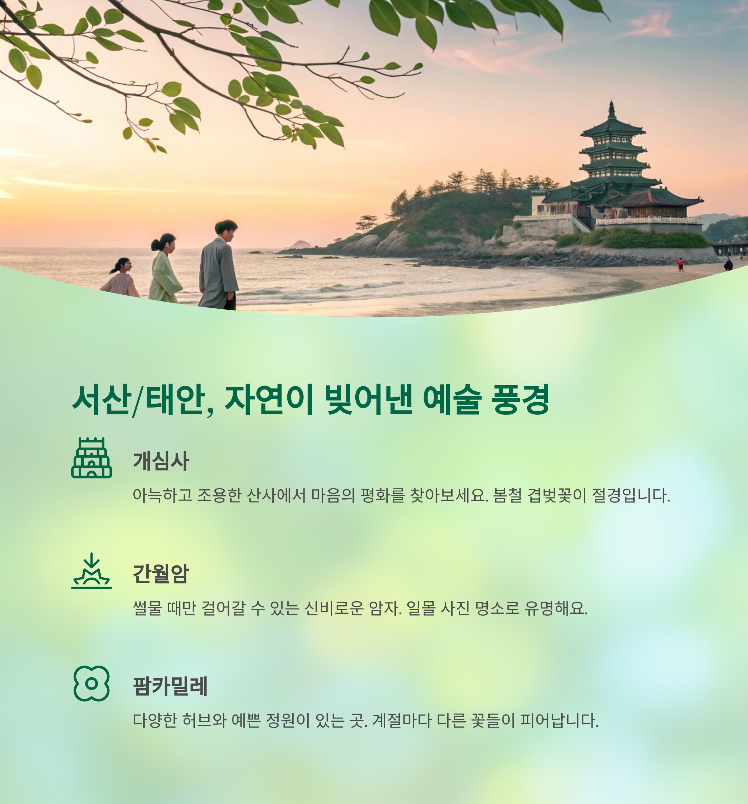 - 서산/태안: 개심사, 간월암, 팜카밀레에서 자연이 빚어낸 아름다운 풍경을 만끽하세요.