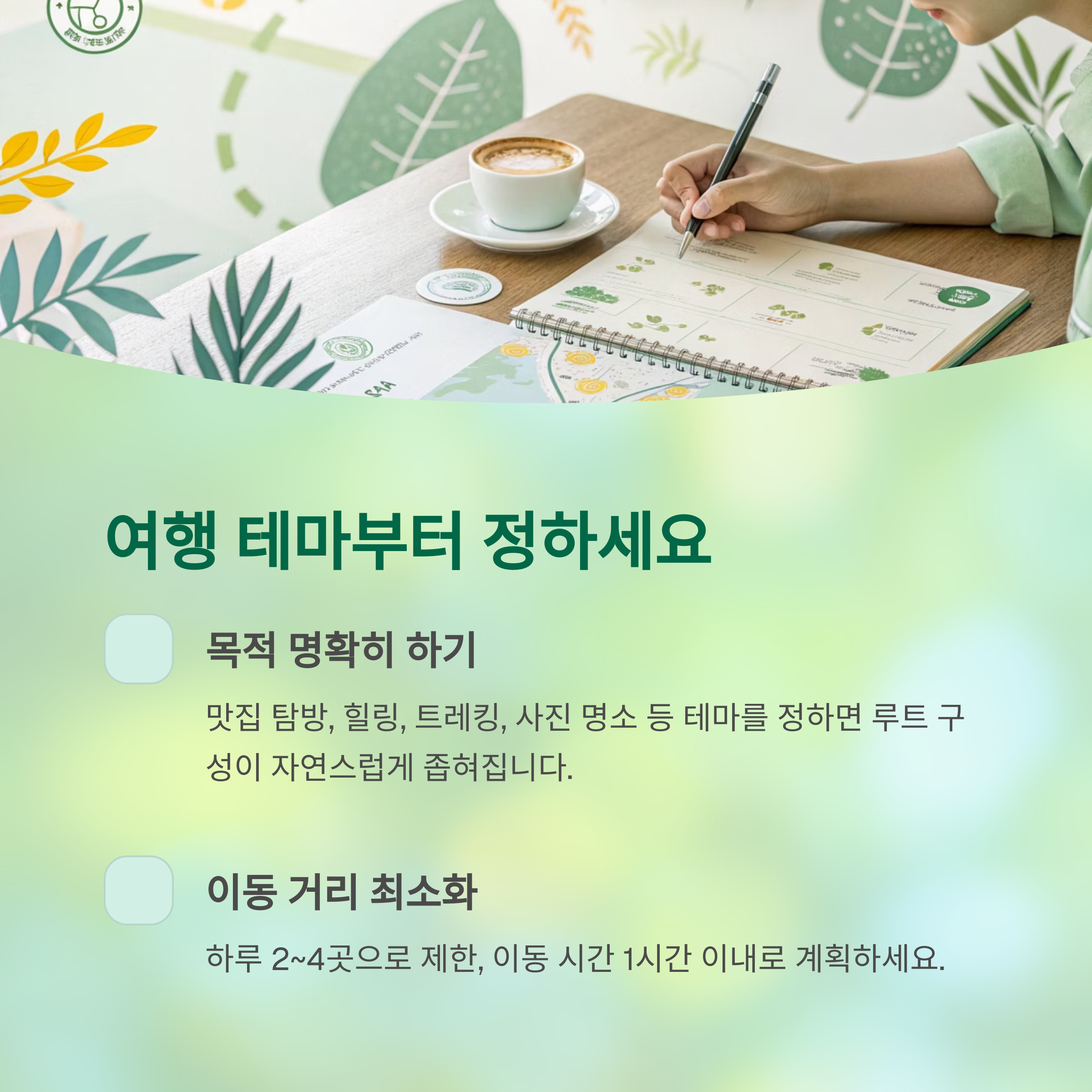 맛집 탐방, 힐링, 트레킹, 사진 명소 위주 등 테마를 정하면