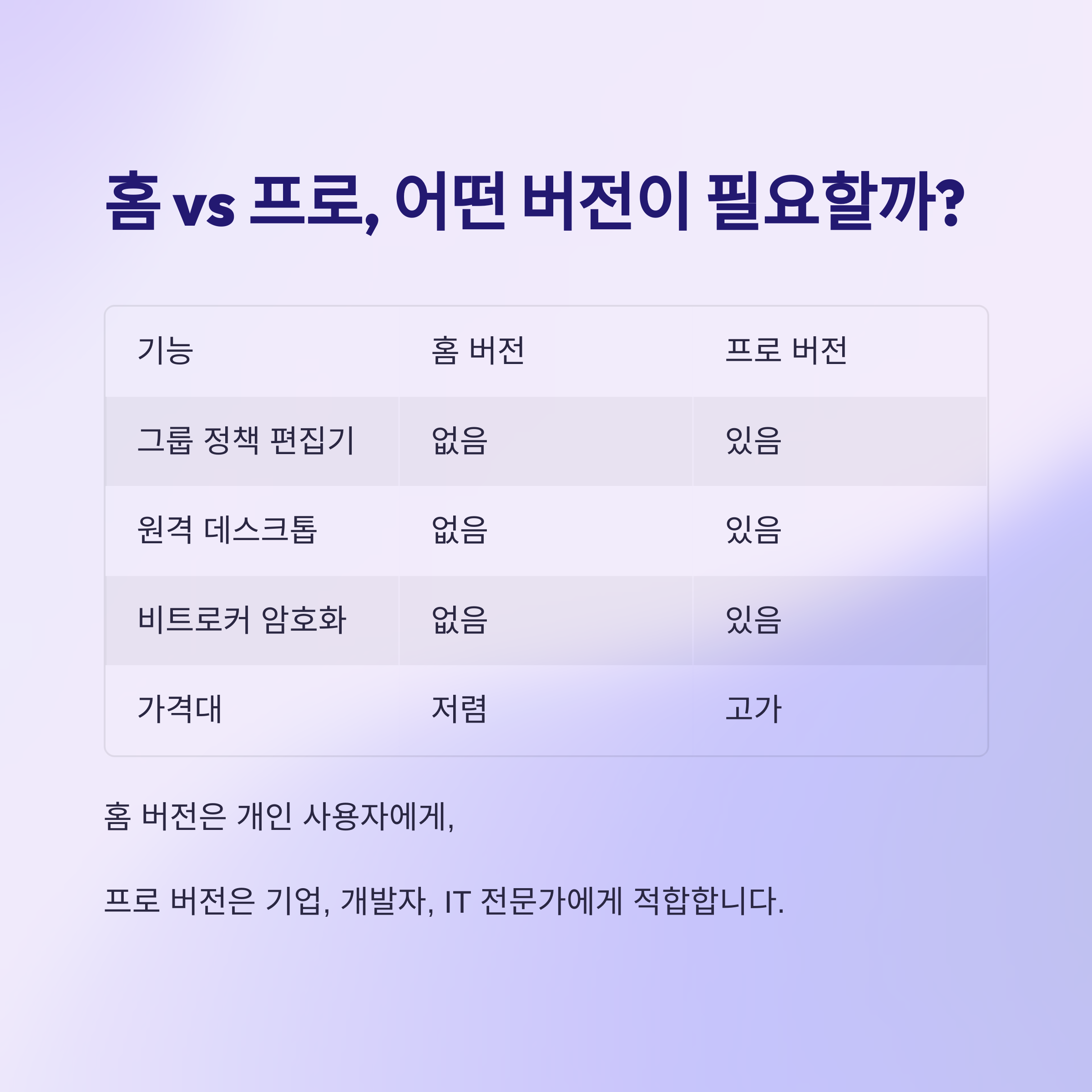 홈과 프로의 차이를 이해하고 본인에게 적합한 버전을 선택해야 합니다.