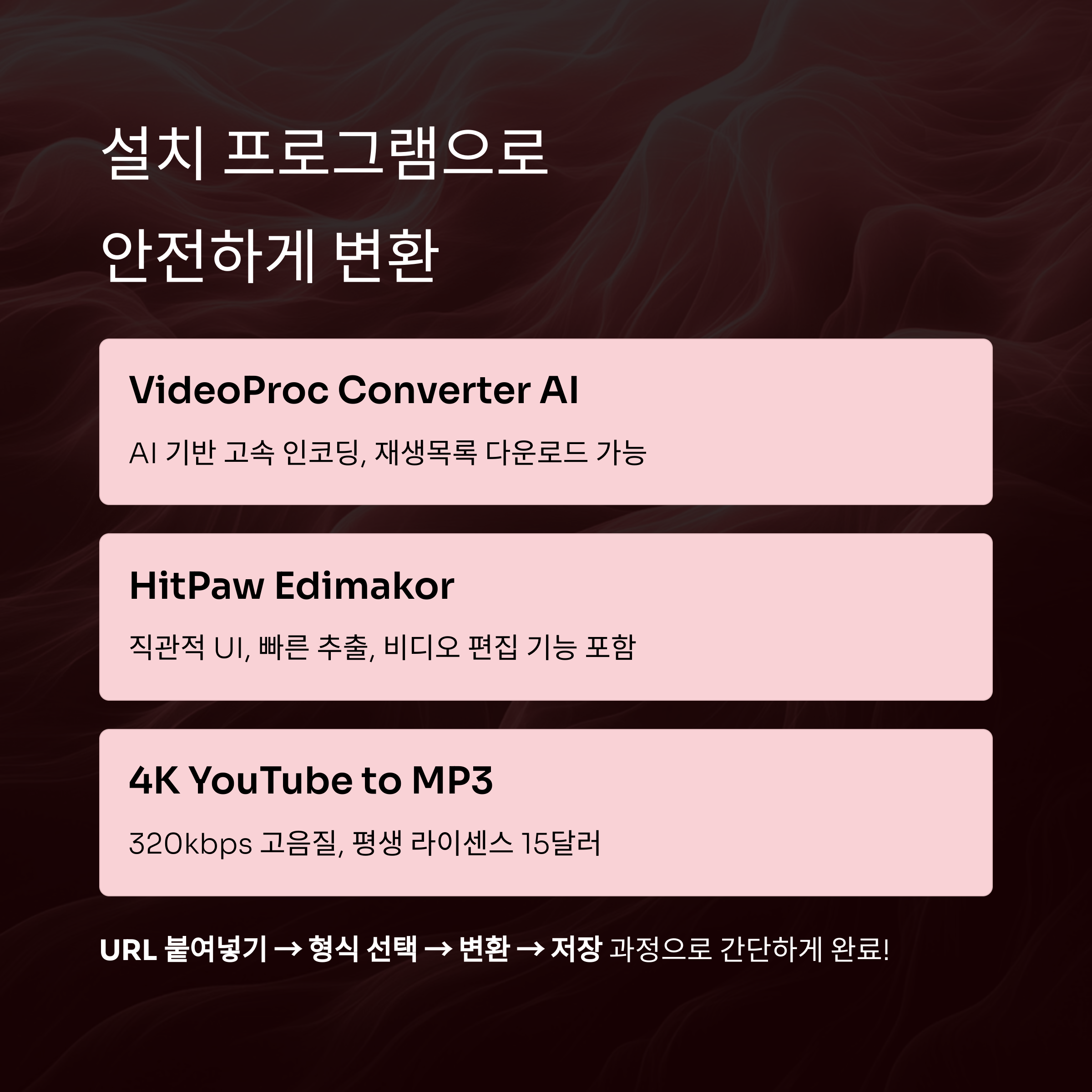 설치 후 동영상 URL 붙여넣기 → 형식 선택 → 변환 버튼 클릭 → 저장까지 간단하게 완료됩니다