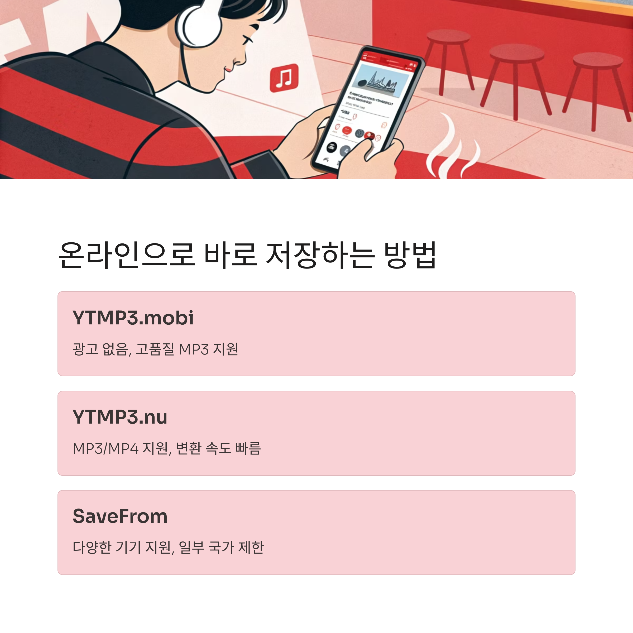 | YTMP3.mobi | MP3 | 매우 쉬움 | 광고 없음, 고품질 |