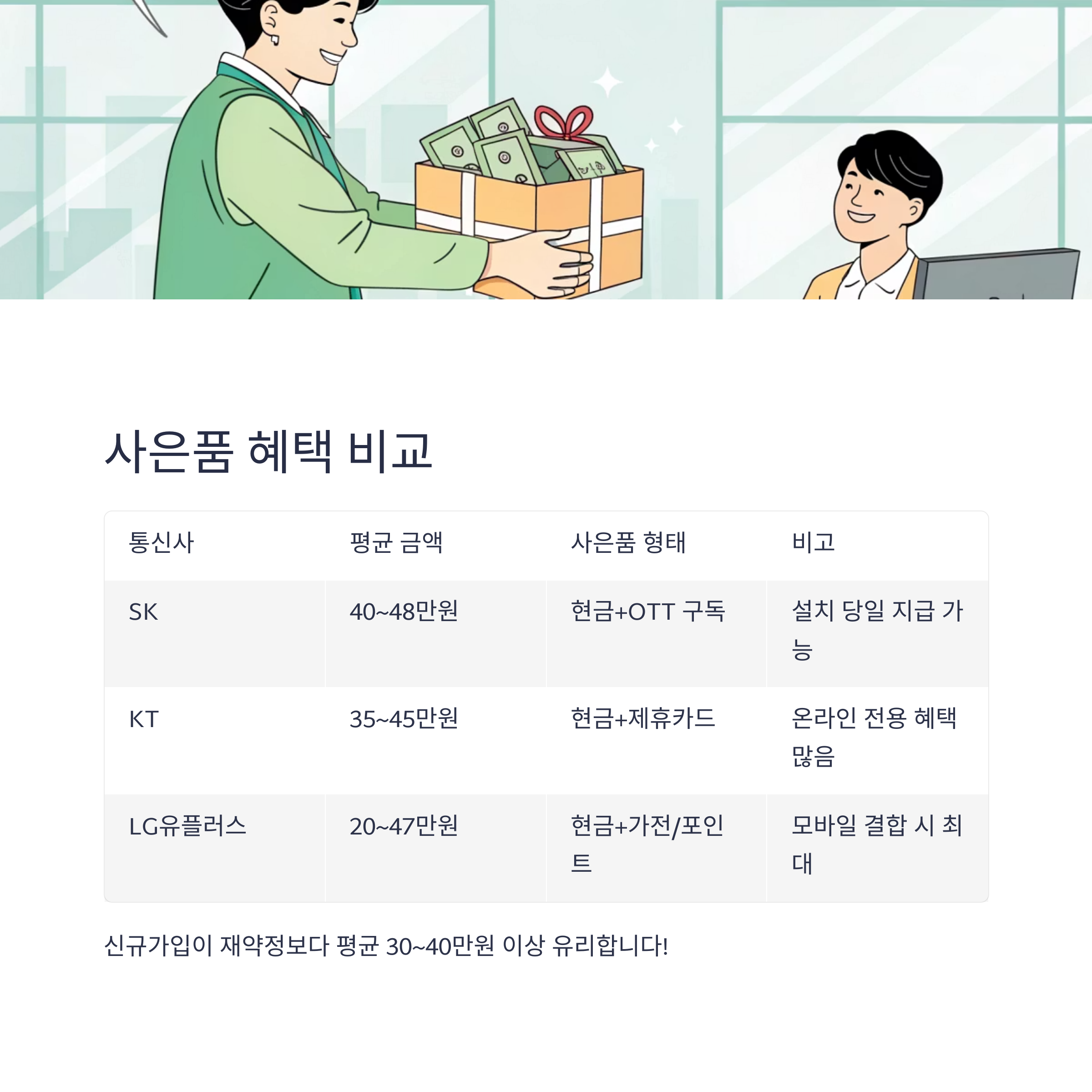 | SK | 40~48만원 | 현금+OTT 구독 | 설치 당일 지급 가능 |