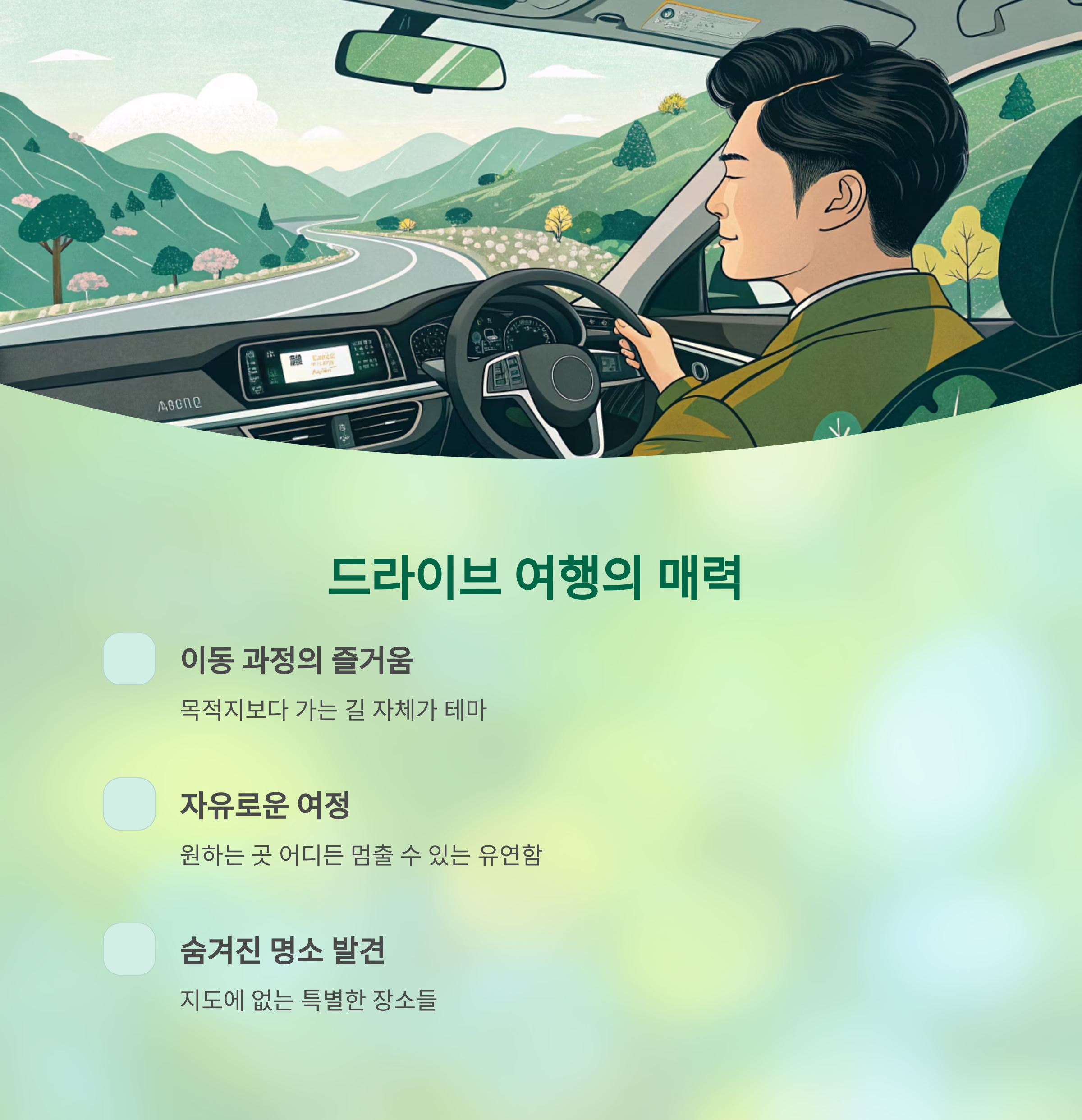 - 드라이브 여행도 테마를 정하면 더 풍성해져요! 해안도로 드라이브, 산악 드라이브, 역사 유적지 순례, 맛집 탐방 드라이브 등 나에게 맞는 테마를 먼저 정해보세요.