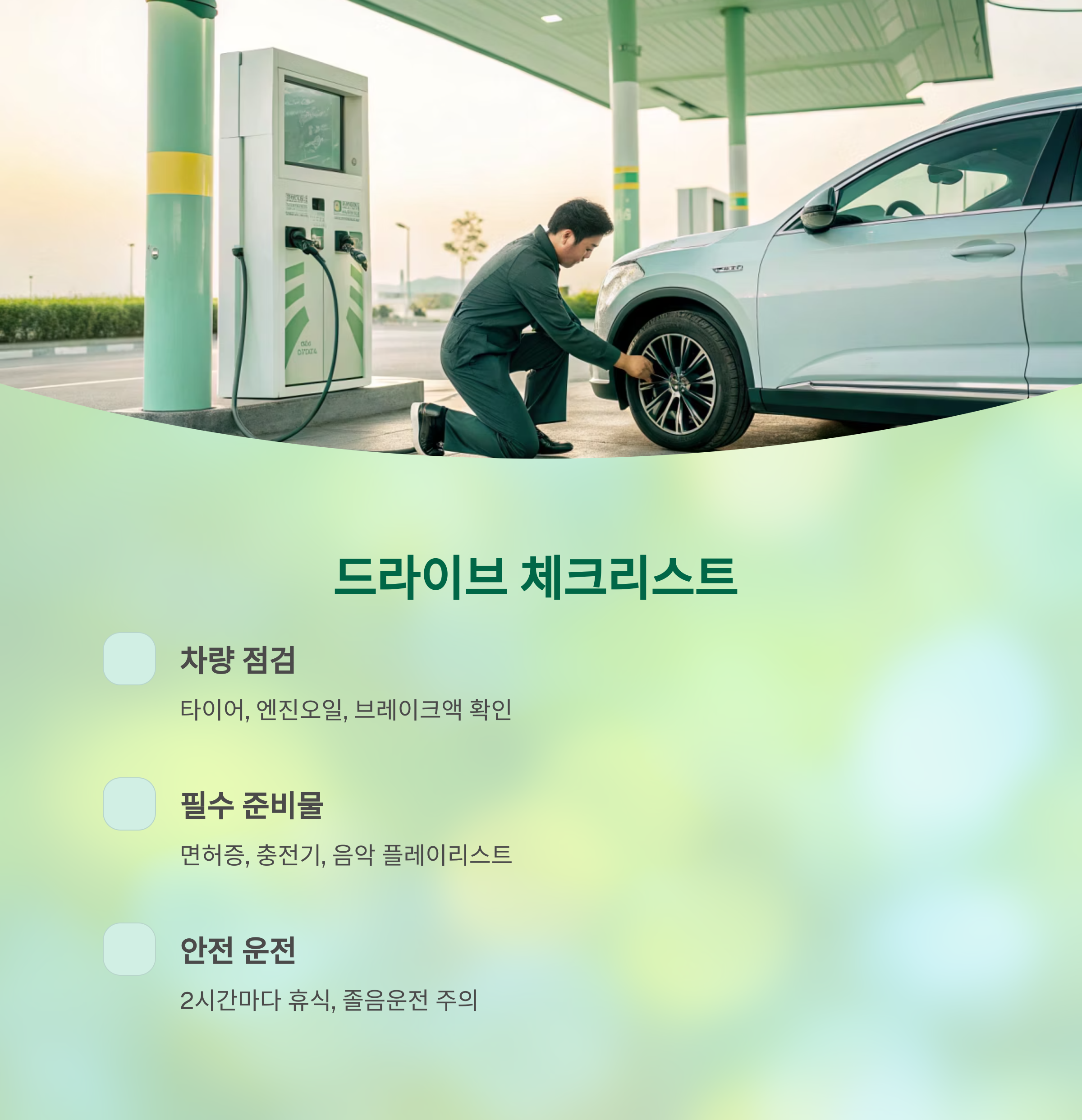 | 차량 점검 | 타이어 공기압, 엔진오일, 브레이크액, 워셔액 | 출발 전 카센터 방문 또는 셀프 점검 |