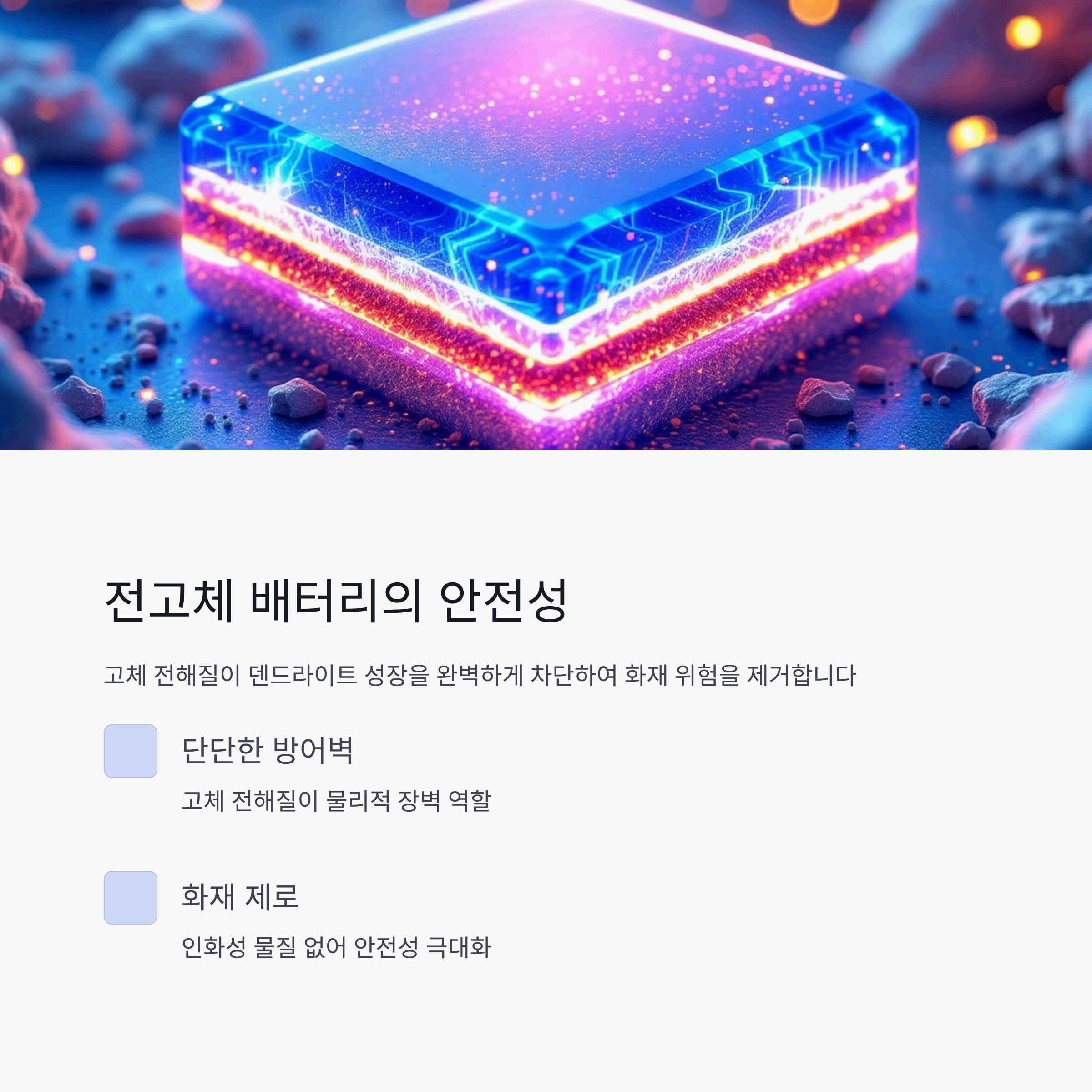 - 불연성 소재: 가장 직관적인 이유죠. 고체 전해질은 불에 타지 않는 소재로 만들어져 화재의 원인 자체가 되질 않습니다. 외부에서 아무리 높은 열이 가해져도 전해질이 불쏘시개 역할을 하지 않는다는 의미입니다.