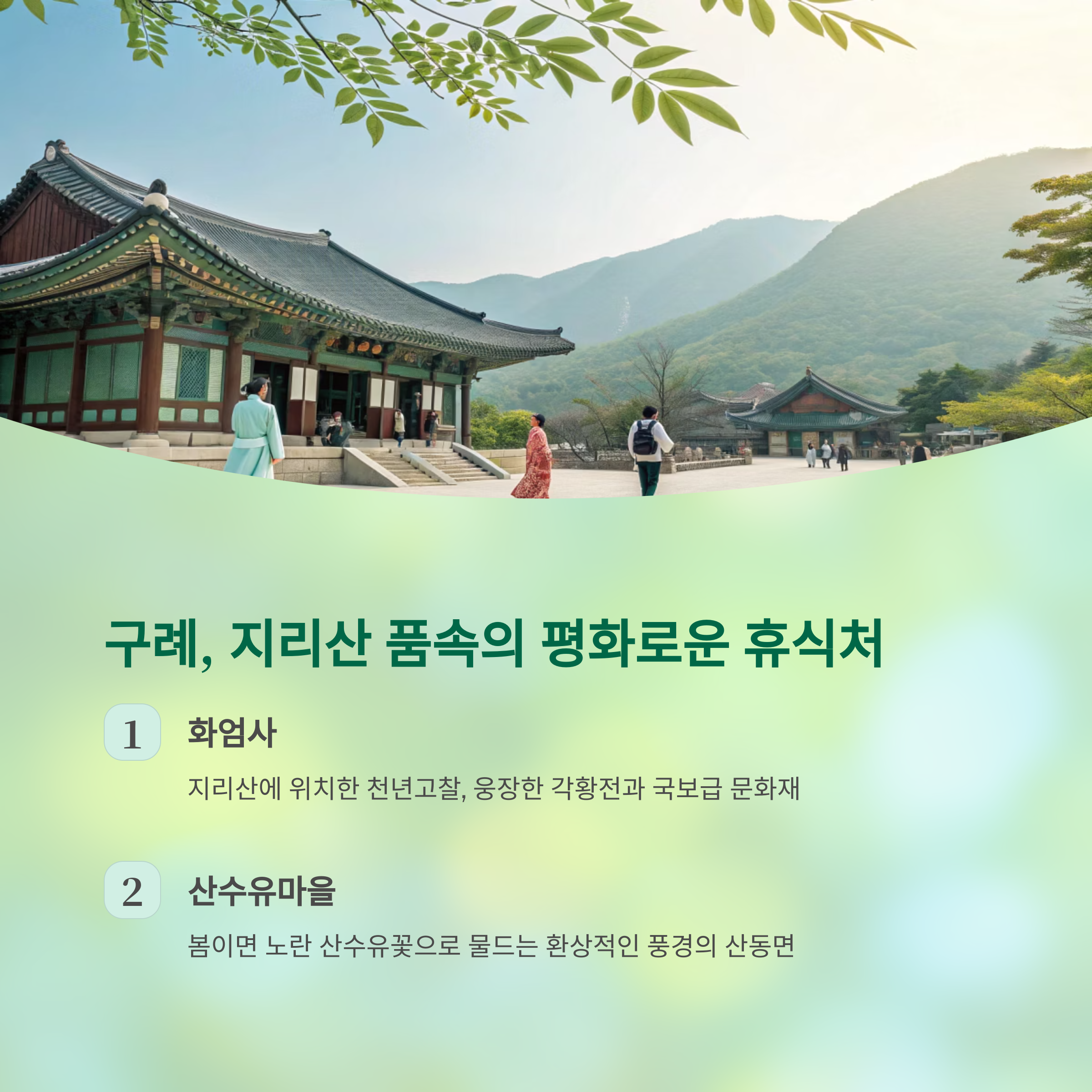 구례는 지리산 자락에 안겨 있는 평화로운 마을이에요. 자연 속에서 진정한 쉼을 얻고 싶은 분들께 강력 추천합니다.