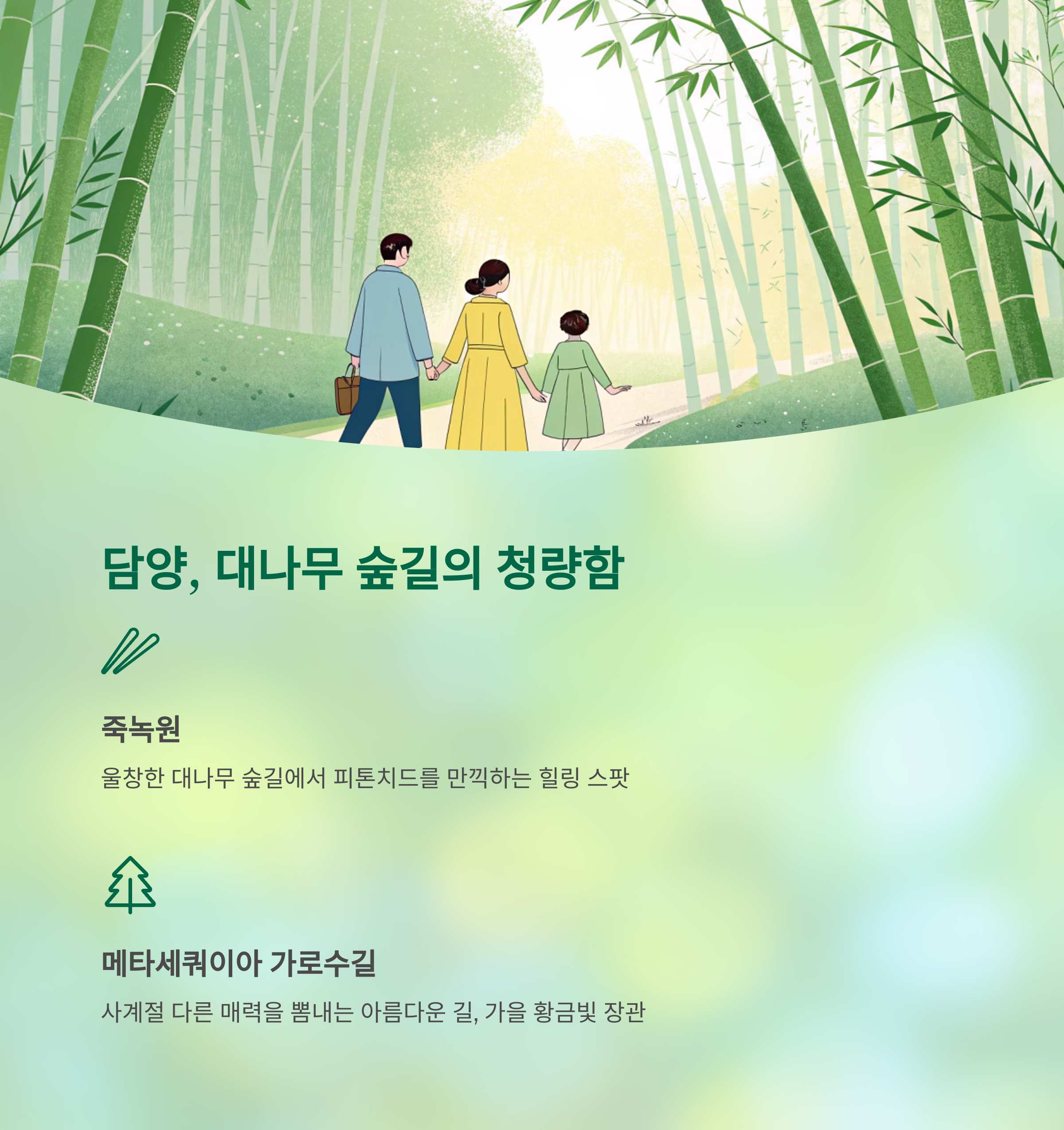 담양은 대나무가 주는 청량함과 고즈넉한 분위기가 일품인 곳이에요. 걷기만 해도 힐링이 되는 마법 같은 공간입니다.