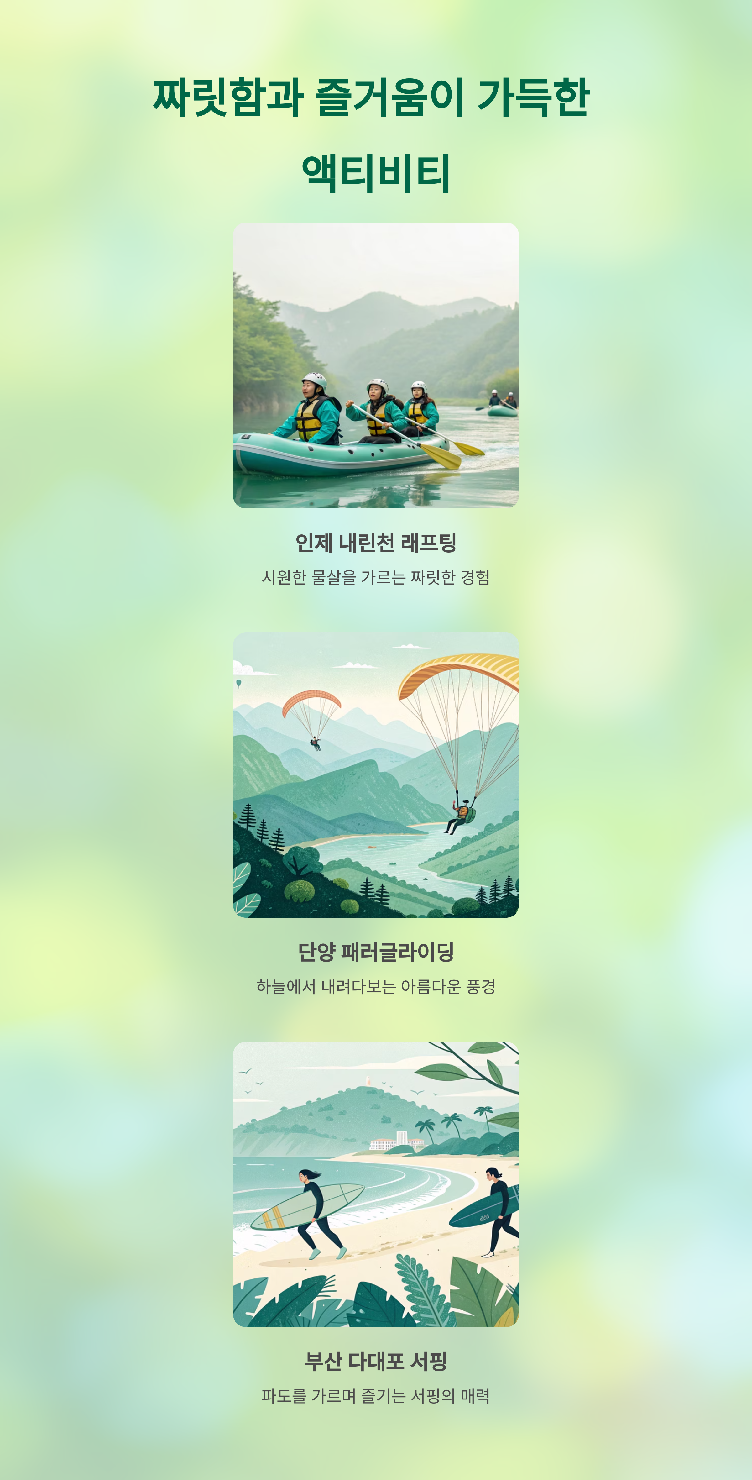 - 강원도 인제 내린천 래프팅: 여름에 딱이죠! 시원한 내린천에서 짜릿한 래프팅을 즐겨보세요. 협동심도 기르고 스트레스도 날려버릴 수 있답니다. 안전 장비와 전문 가이드가 있으니 걱정 마세요!