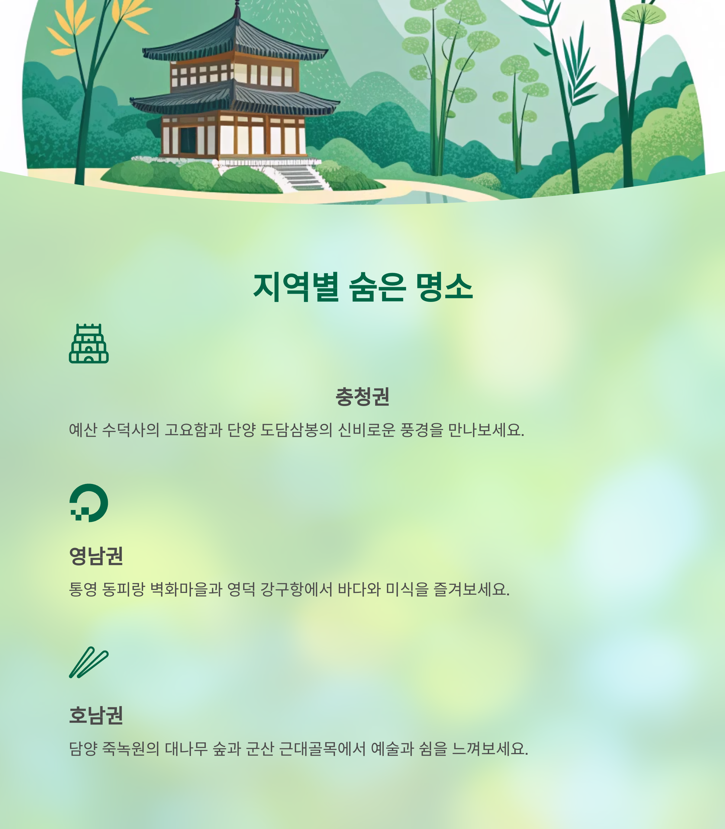 - 나만의 여행: 소개된 곳들 외에도 대한민국 곳곳에는 숨겨진 아름다운 여행지들이 많으니, 자신만의 취향에 맞는 곳을 찾아 떠나보세요!