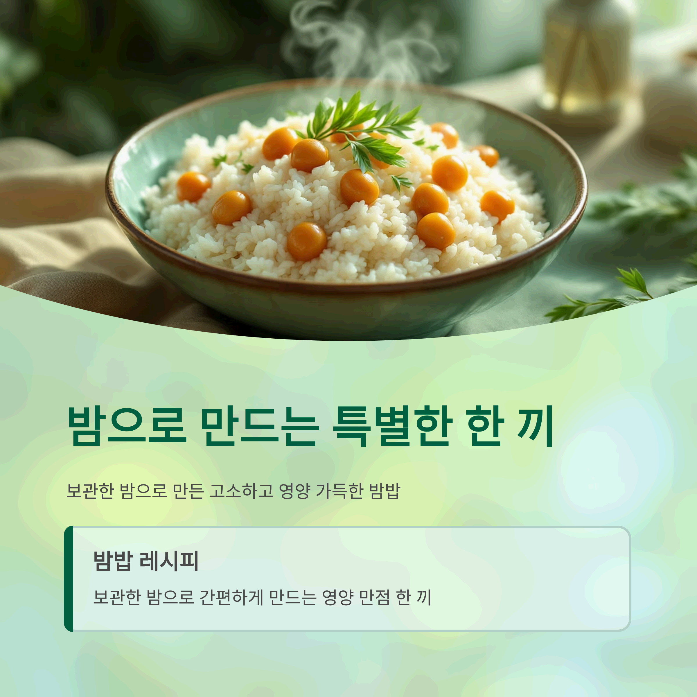 - 방법: 밥솥에 씻은 쌀과 물을 넣고, 그 위에 냉동 깐밤을 씻지 않고 그대로 올려 취사 버튼만 누르면 완성! 밤의 단맛이 밥에 은은하게 배어 정말 맛있어요.