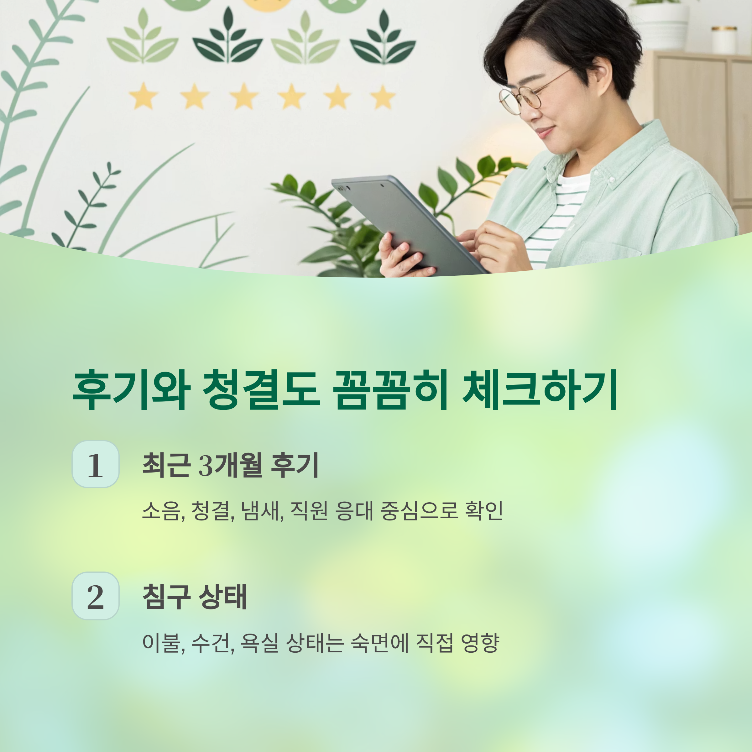특히 이불과 수건 상태, 욕실 곰팡이, 배수 상태 등의 언급이 많다면 피하는 것이 좋습니다.
