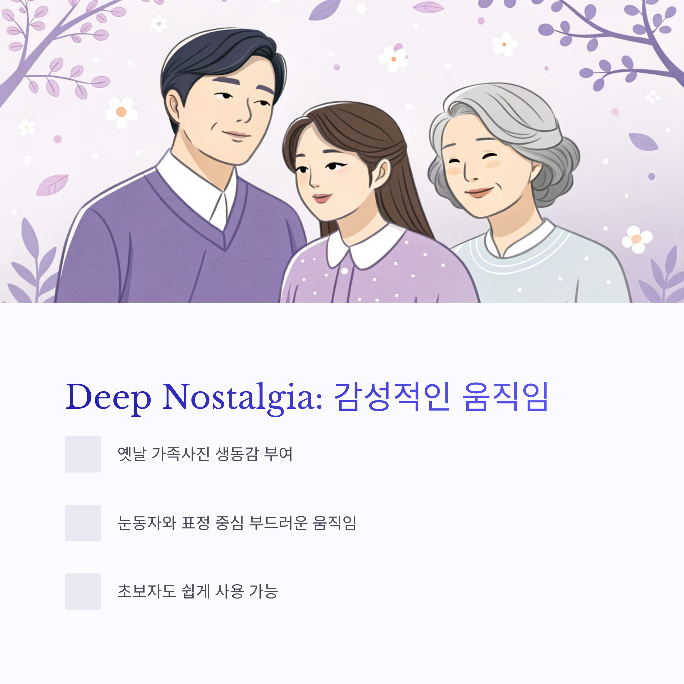 | Deep Nostalgia | 부드러운 얼굴 움직임 중심 | 감성 콘텐츠, 가족 영상화 |