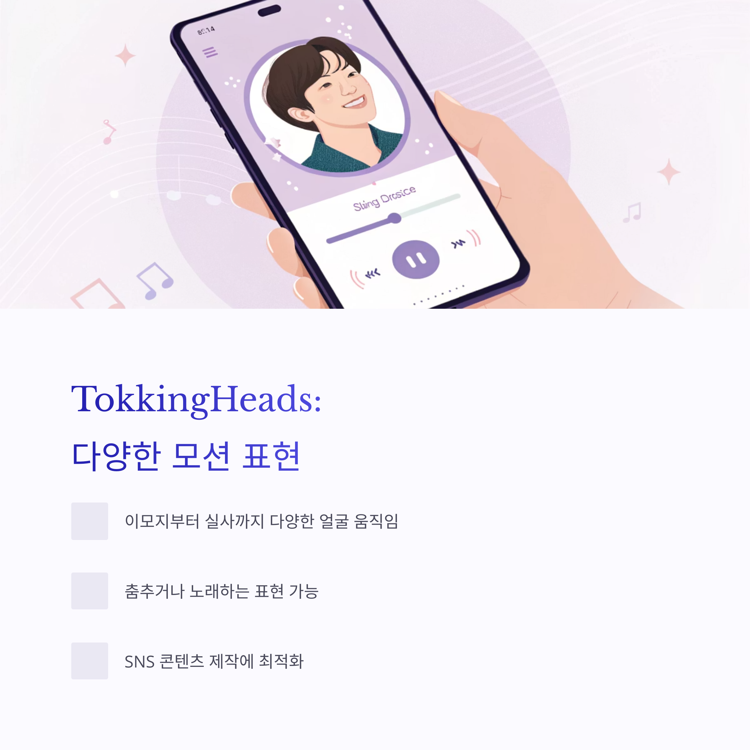 | TokkingHeads | 다양한 표정과 춤 모션 | SNS 짧은 영상, 재미용 콘텐츠 |
