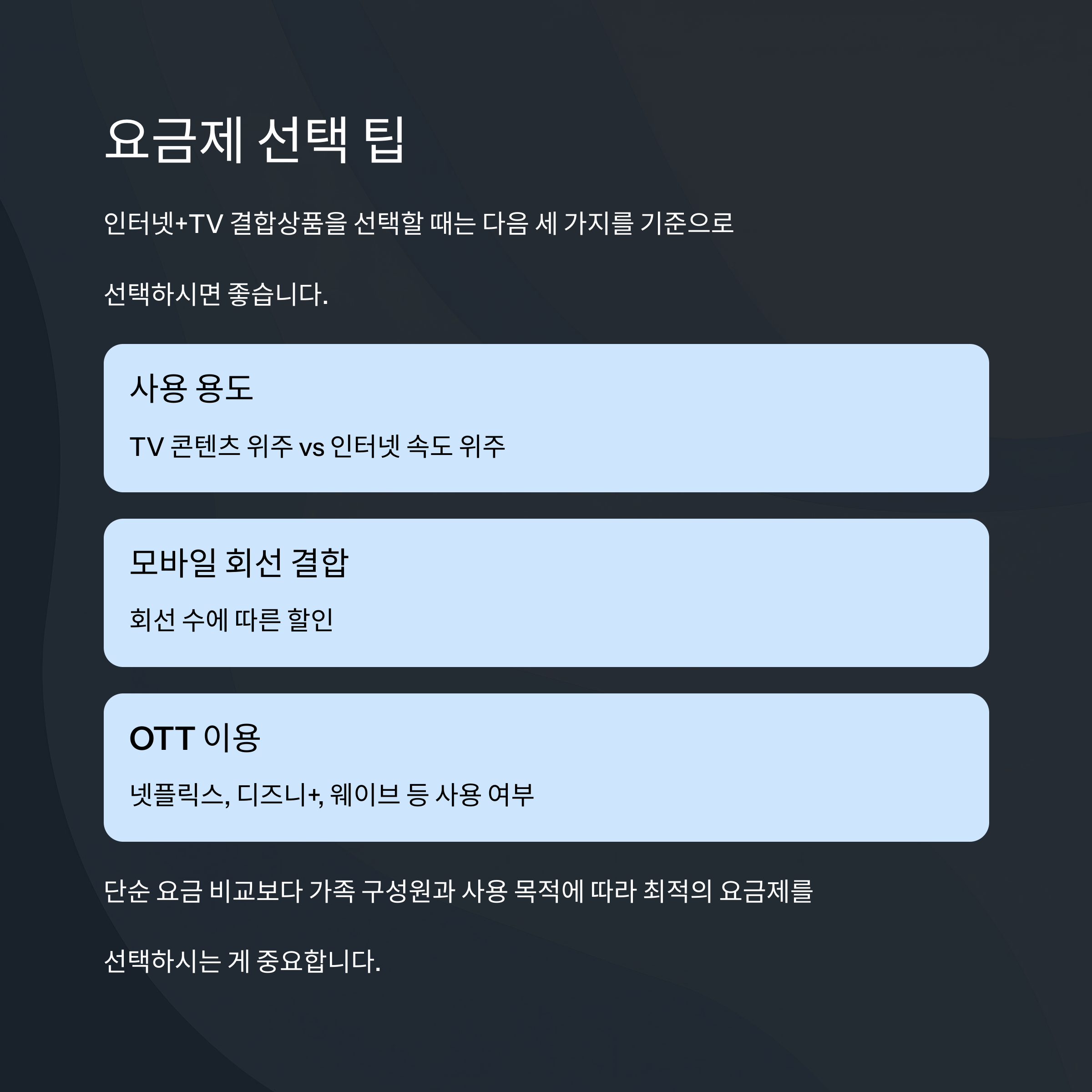 | 사용 용도 | TV 콘텐츠 위주 vs 인터넷 속도 위주 |