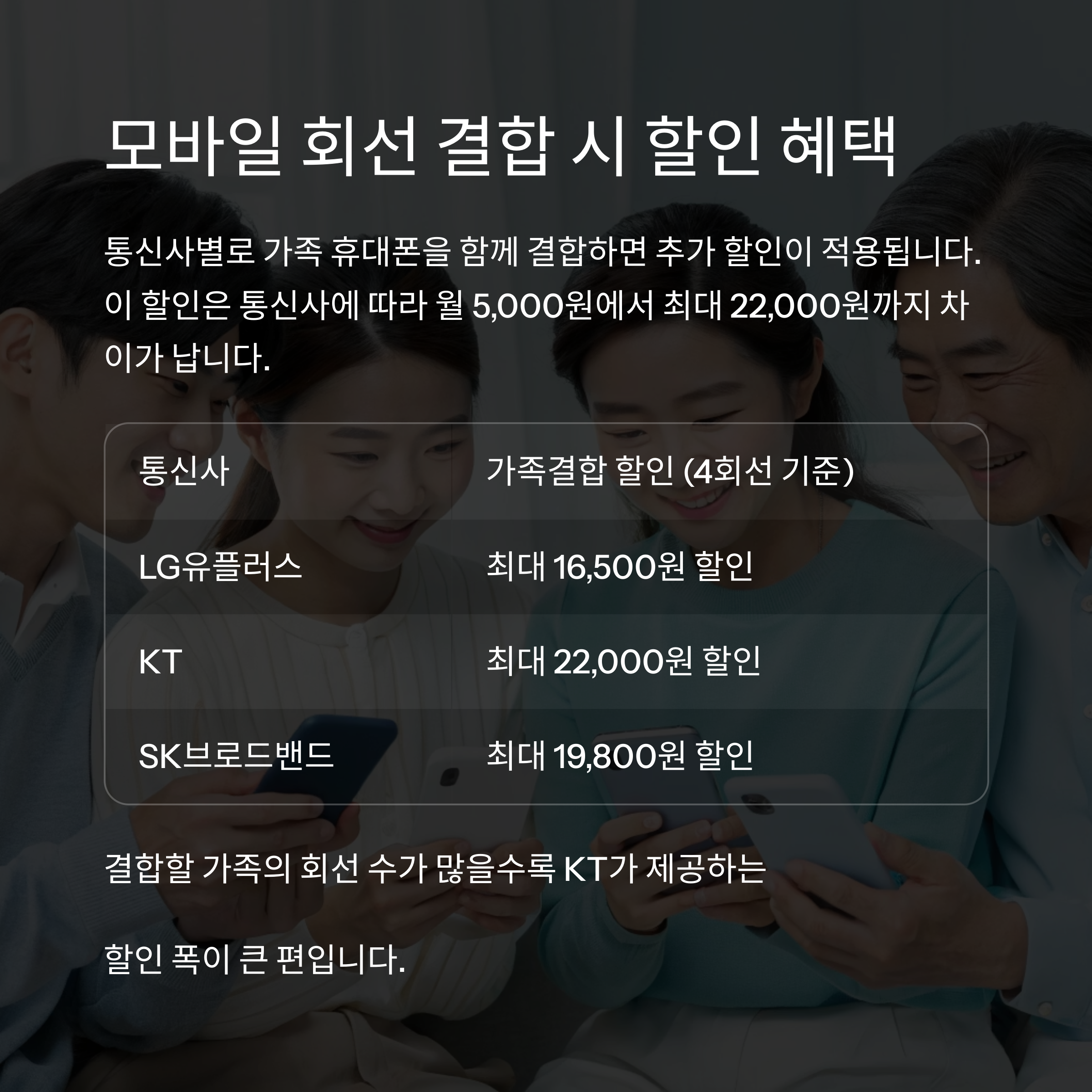 통신사별로 가족 휴대폰을 함께 결합하면 추가 할인이 적용됩니다.