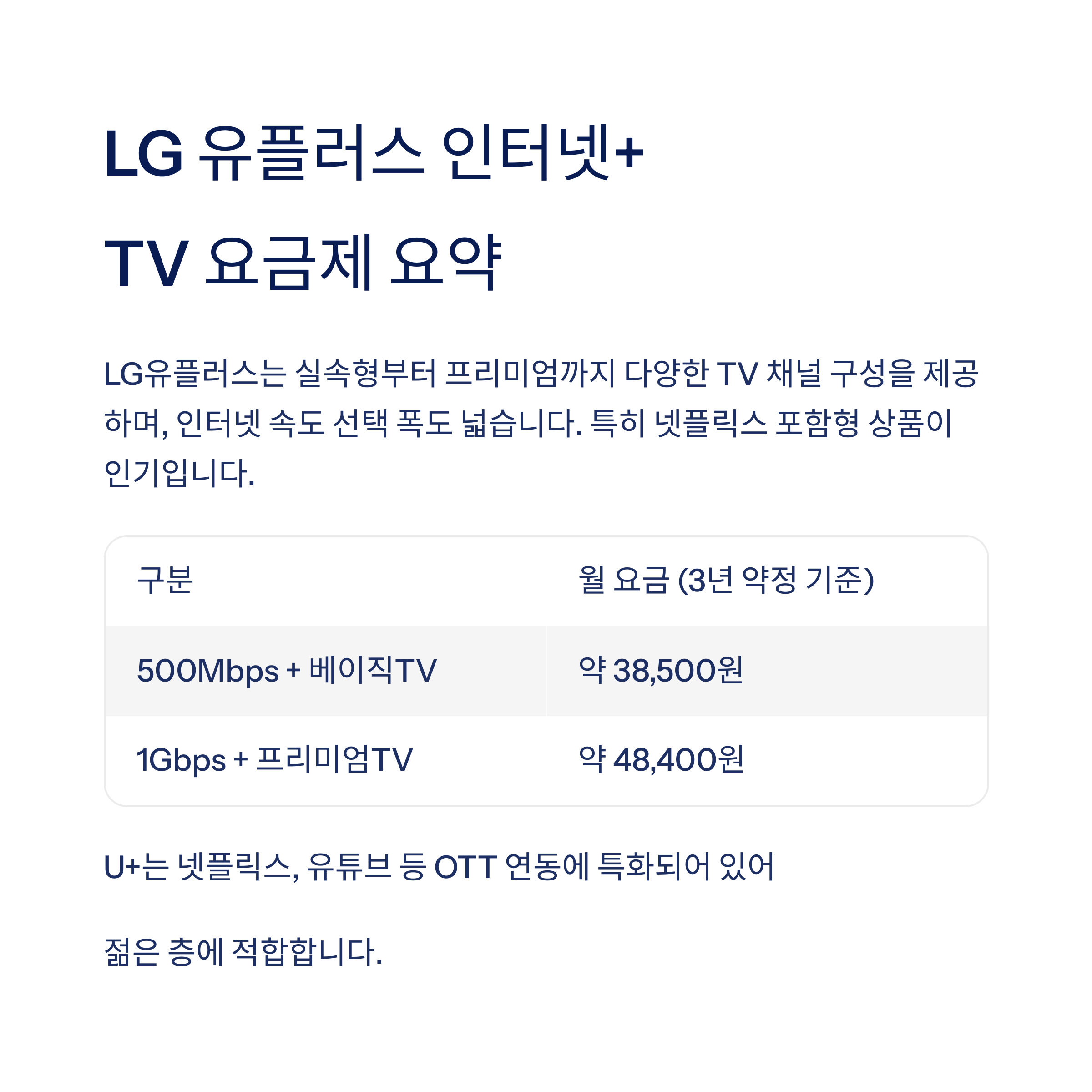 LG 유플러스 인터넷+TV 요금제 요약