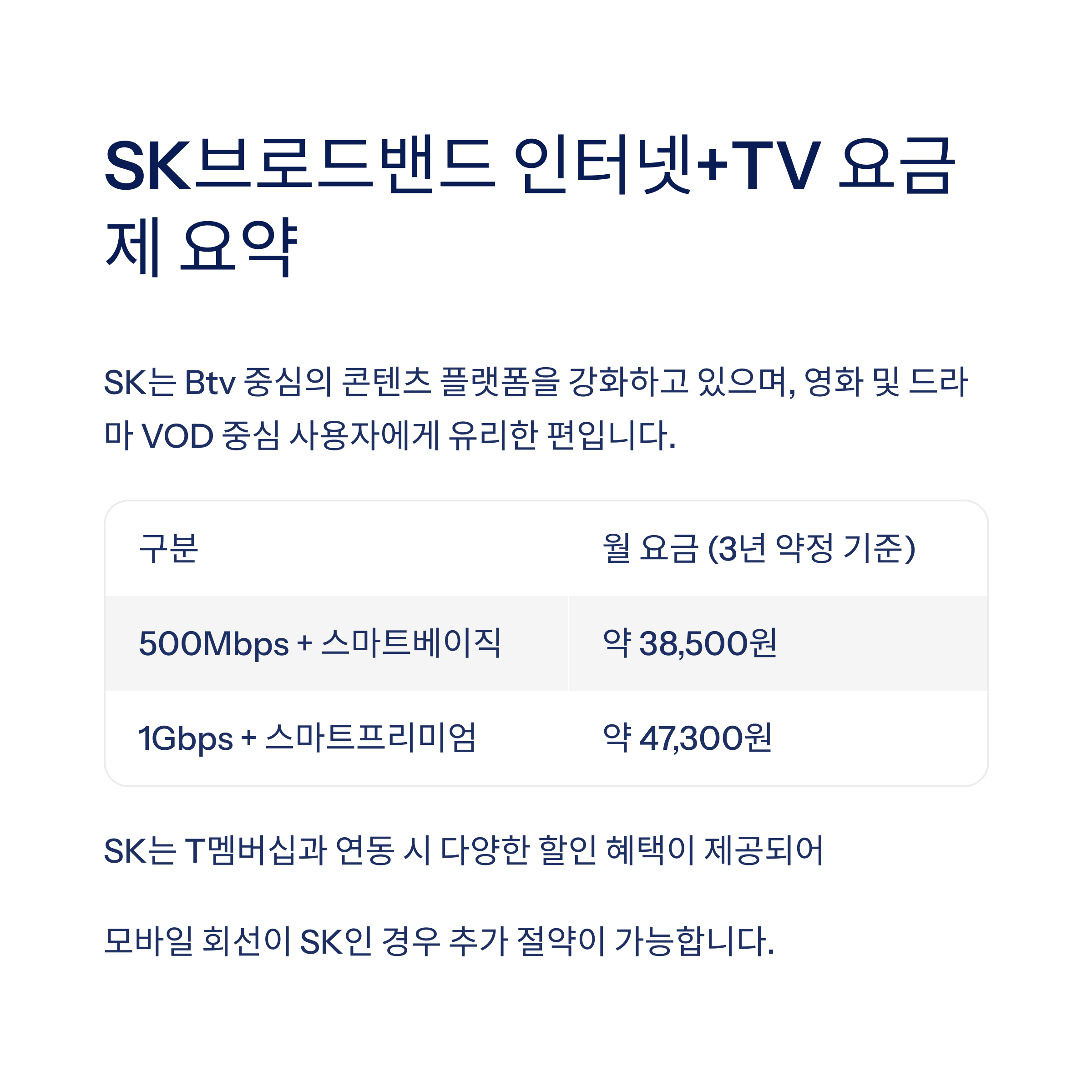 SK브로드밴드 인터넷+TV 요금제 요약