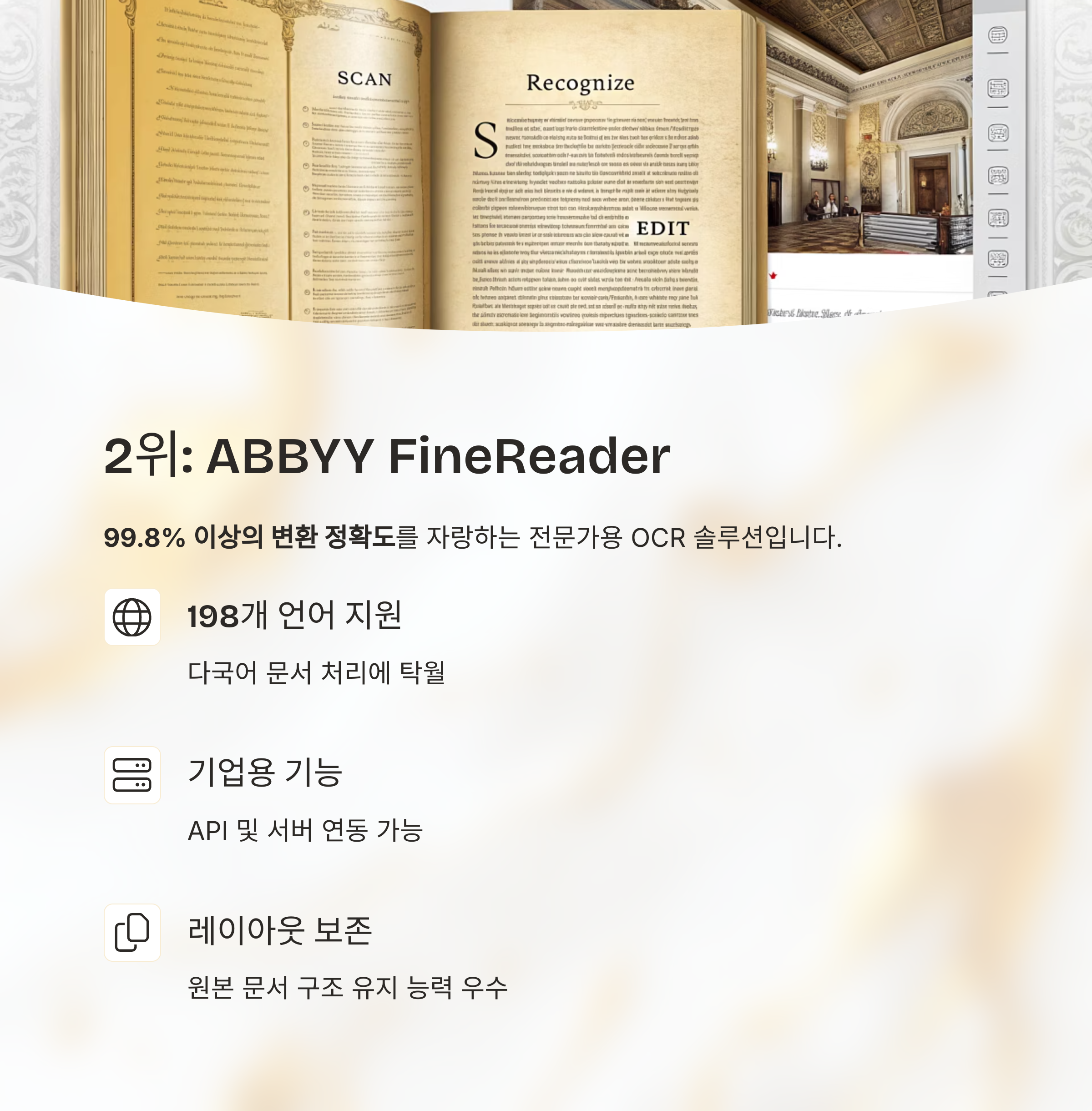 정확도와 안정성 모두 인정된 글로벌 OCR 강자입니다.