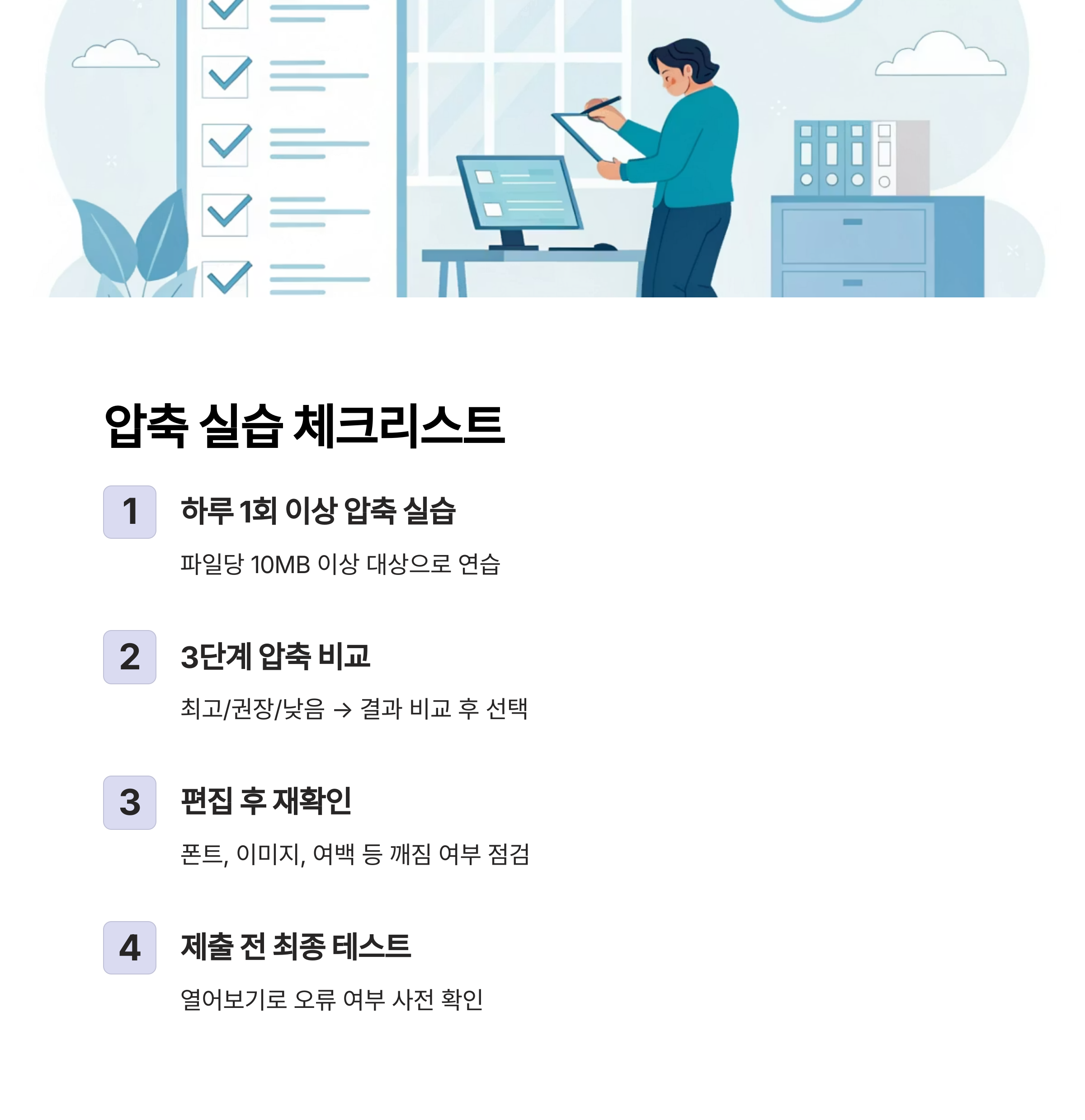핵심: 압축 후 결과 파일을 반드시 열어보고, 텍스트·이미지 깨짐 여부 확인하세요.